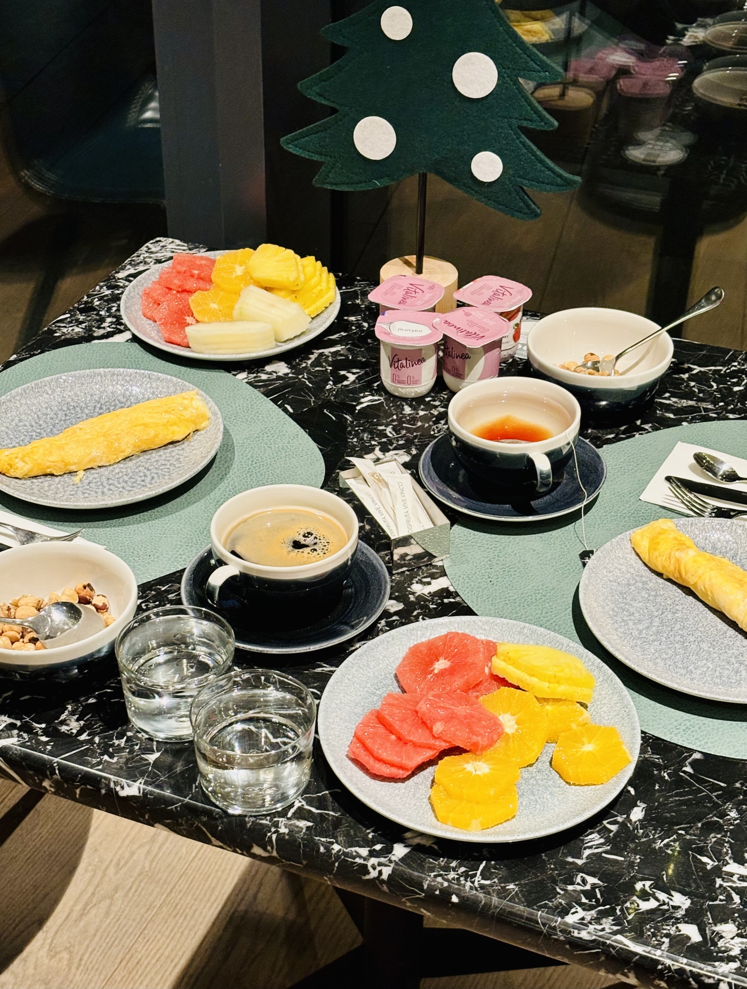 W hotelowych śniadaniach zawsze najlepsze jest przede wszystkim to, że ktoś robi je za nas, a w Vincci Bilbao na szczęście powodów do zadowolenia w tym temacie jest więcej. Hotelowa jadalnia jest na tyle przytulna i zgrabnie zaprojektowana, że nawet przy pełnym obłożeniu (które doskwierało w weekendy, tj. od 30 grudnia do 1 stycznia i w kolejny weekend 5-7 stycznia) śniadanie dało się zjeść w przyjemnych okolicznościach przyrody. Oferta śniadaniowa jest urozmaicona, do wyboru mamy sporo świeżych owoców i warzyw (grejpfruty i pomidory ratowały nam życie). Sympatyczny kucharz codziennie smaży na zamówienie omlety z różnymi dodatkami (pomidory, grzyby, jamon, ser, etc.), jajecznicę i jajka sadzone w wersji live cooking. Jest świeżo pieczone (czyt. podgrzewane) pieczywo bezglutenowe na życzenie, ciastki bez glutenu, jeżeli ktoś lubi i potrzebuje, etc. Przy dłuższym, ponad tygodniowym pobycie różnorodność śniadaniowa ma znaczenie, a Vincci staje na wysokości zadania.