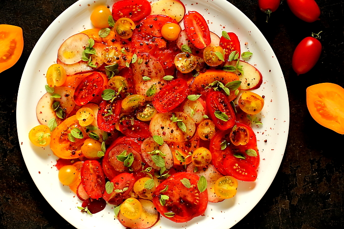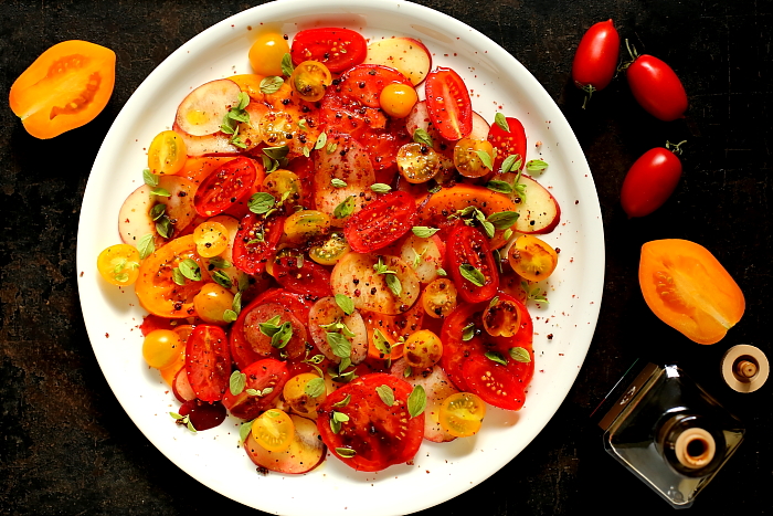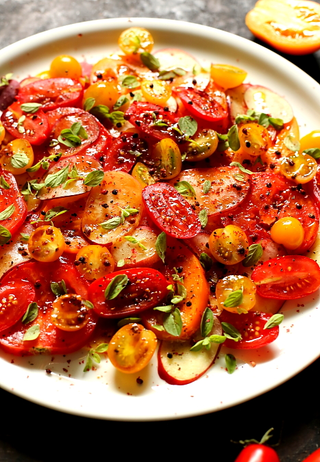 Brzoskwinie z pomidorami – doskonała sałatka na lato – PRZEPIS: