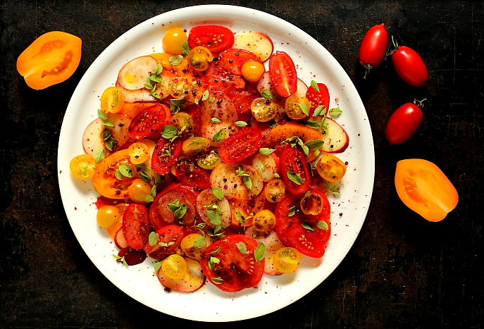 Najlepiej będzie, jeśli sięgniesz po pomidory w różnych kształtach i kolorach. W sezonie świetnie sprawdzają się, obok niezawodnych malinówek, m.in. niesamowicie słodkie i aromatyczne pomidory daktylowe.