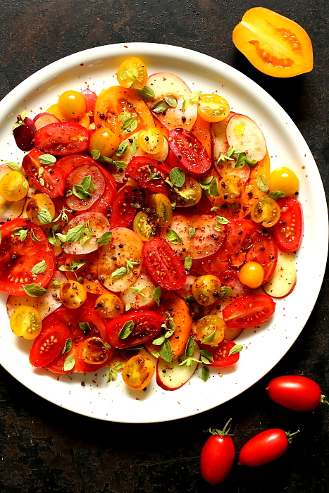 Pomidory to wybitnie wszechstronne owoce. Świetnie komponują się ze swymi słodszymi pobratymcami, choćby takimi jak maliny, truskawki, morele, czereśnie, wiśnie, śliwki czy brzoskwinie. Wszystkie te owoce, z pomidorami na czele, najsmaczniejsze są właśnie teraz – w środku lata. Warto czerpać z sezonu – dosłownie – pełnymi garściami i jeść roślinne skarby natury jak najczęściej, od śniadania do kolacji :-)