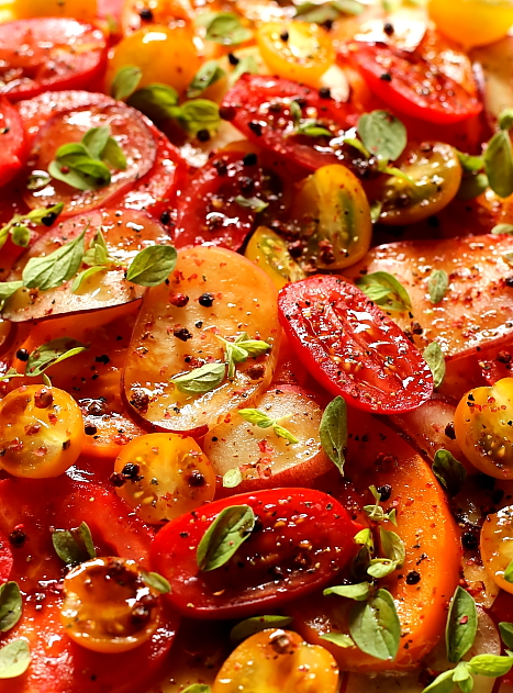 Świeże, pełne aromatu oregano plus pomidory to zawsze strzał w dziesiątkę. Równie dobrze sprawdzi się też tymianek, mięta lub bazylia (szczególnie tajska lub grecka). Zainwestuj też w balsamico wysokiej jakości. Na occie balsamicznym naprawdę nie warto oszczędzać – wydaj na niego więcej, a zauważysz, że jest nieporównanie smaczniejszy, a do tego ma fajną gęstszą konsystencję.