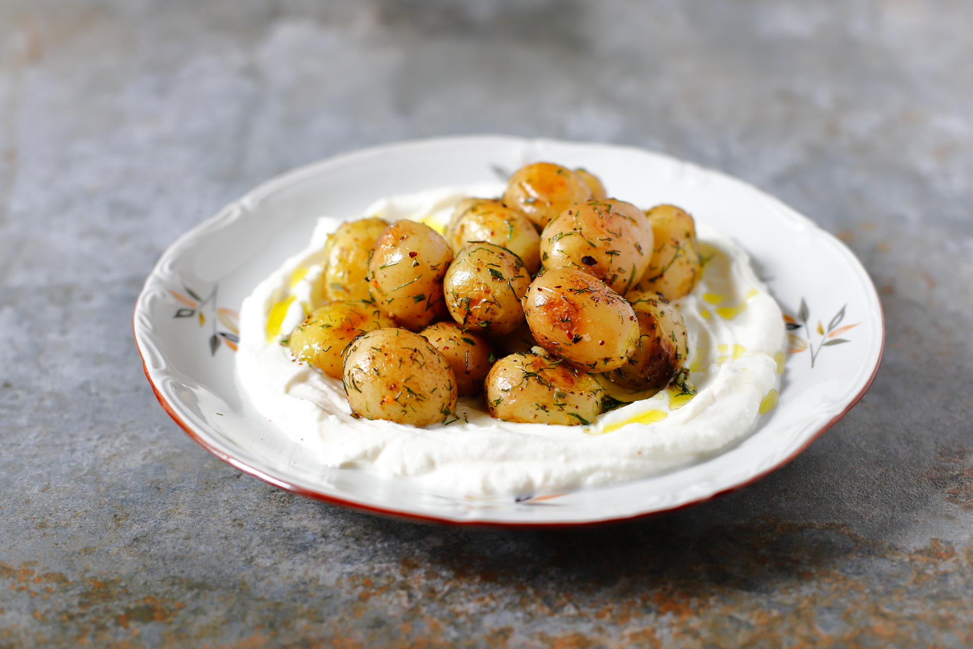 Smażone młode ziemniaki z labneh na pyszny letni obiad.