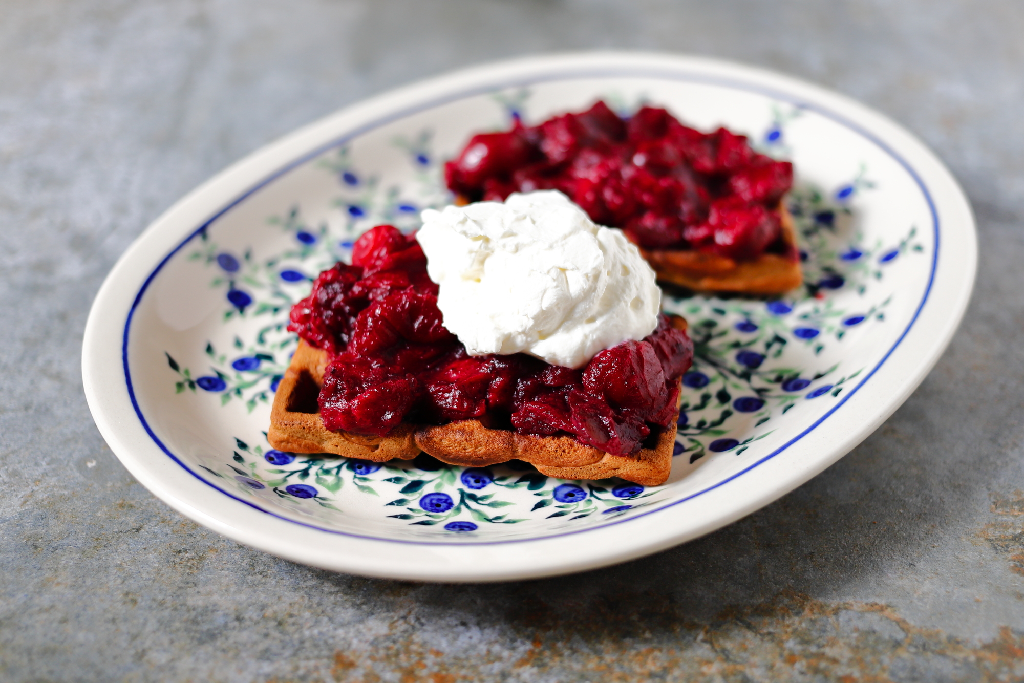 Gofry z mąki kasztanowej z wiśniami.