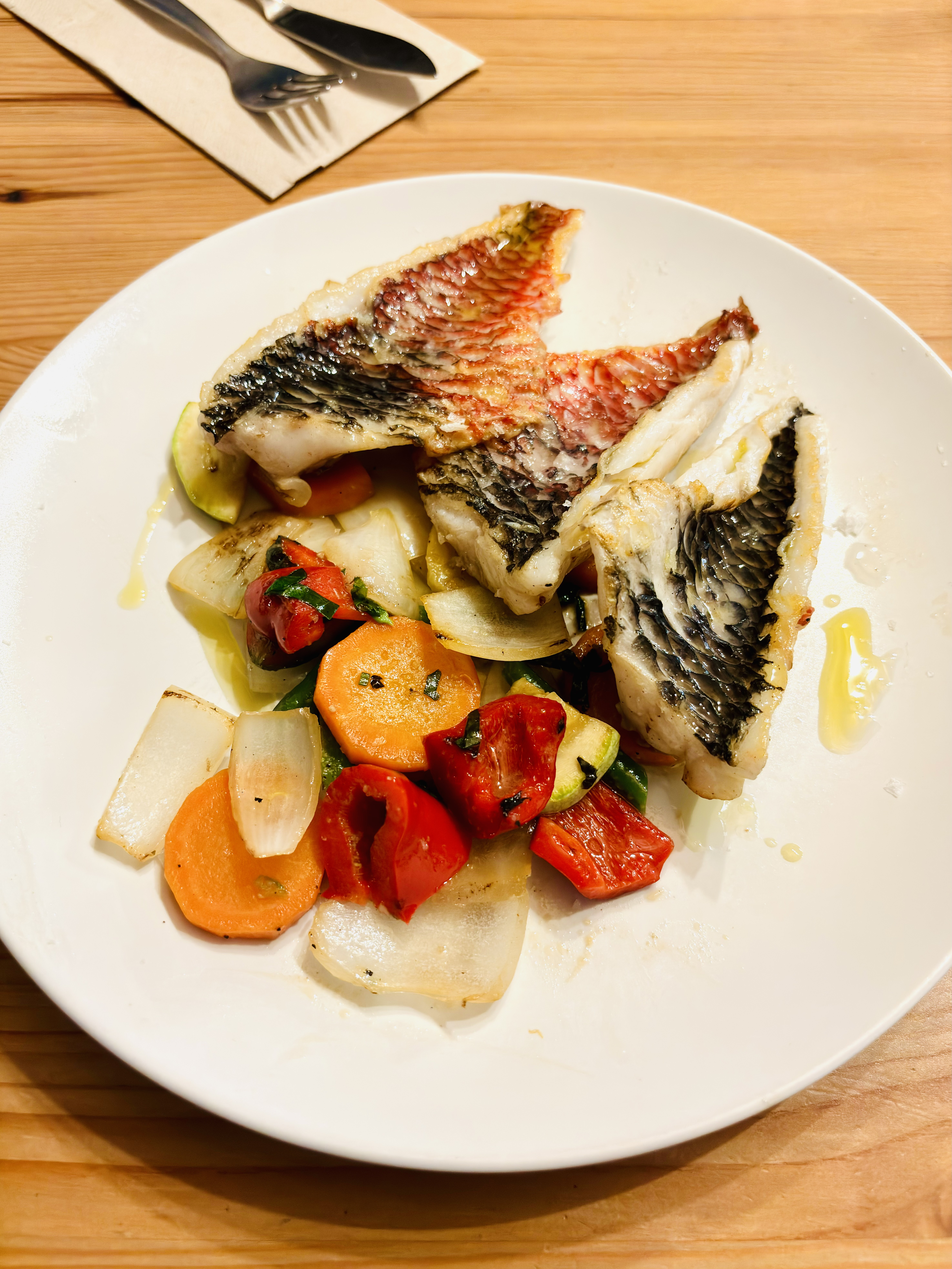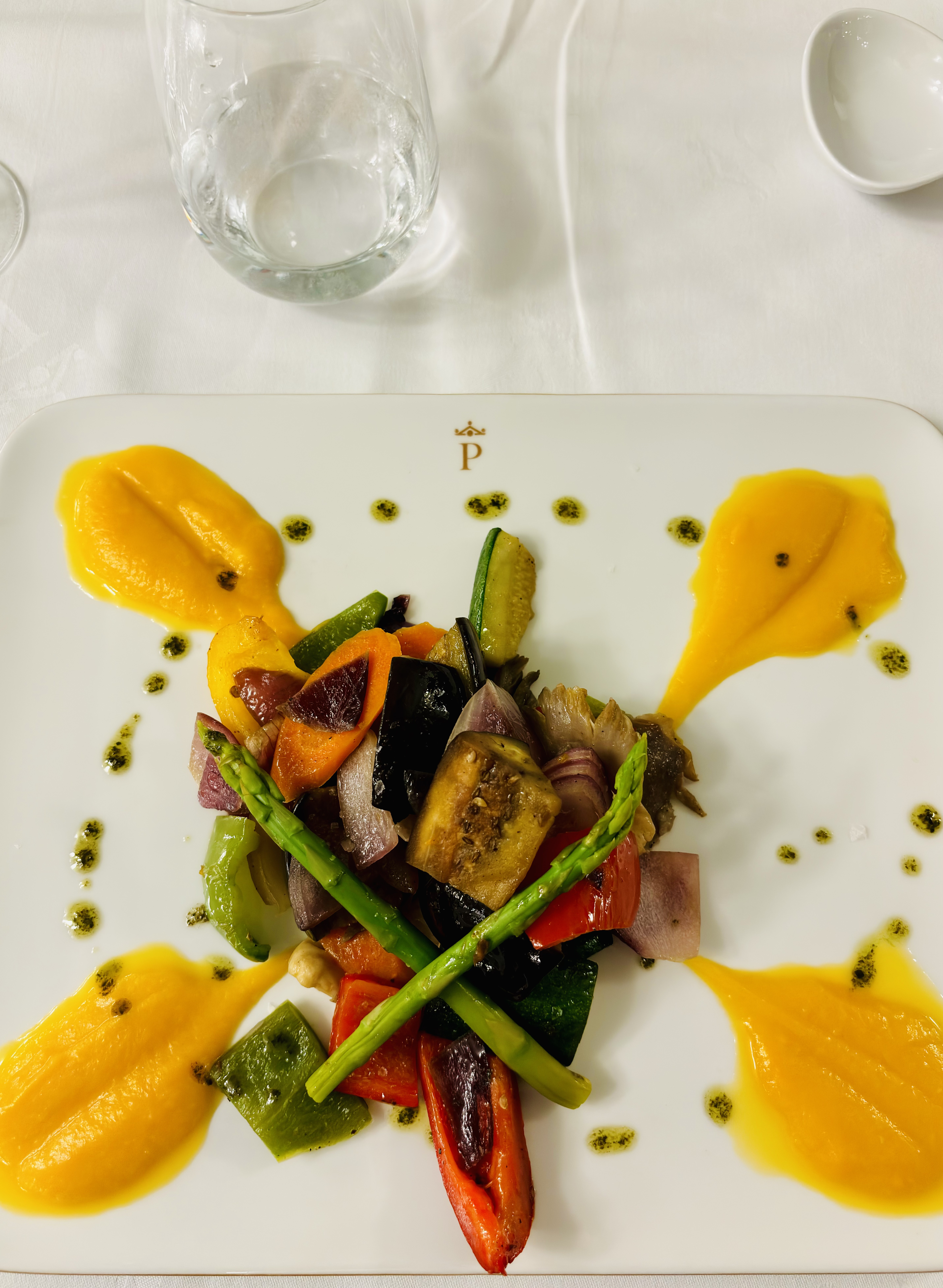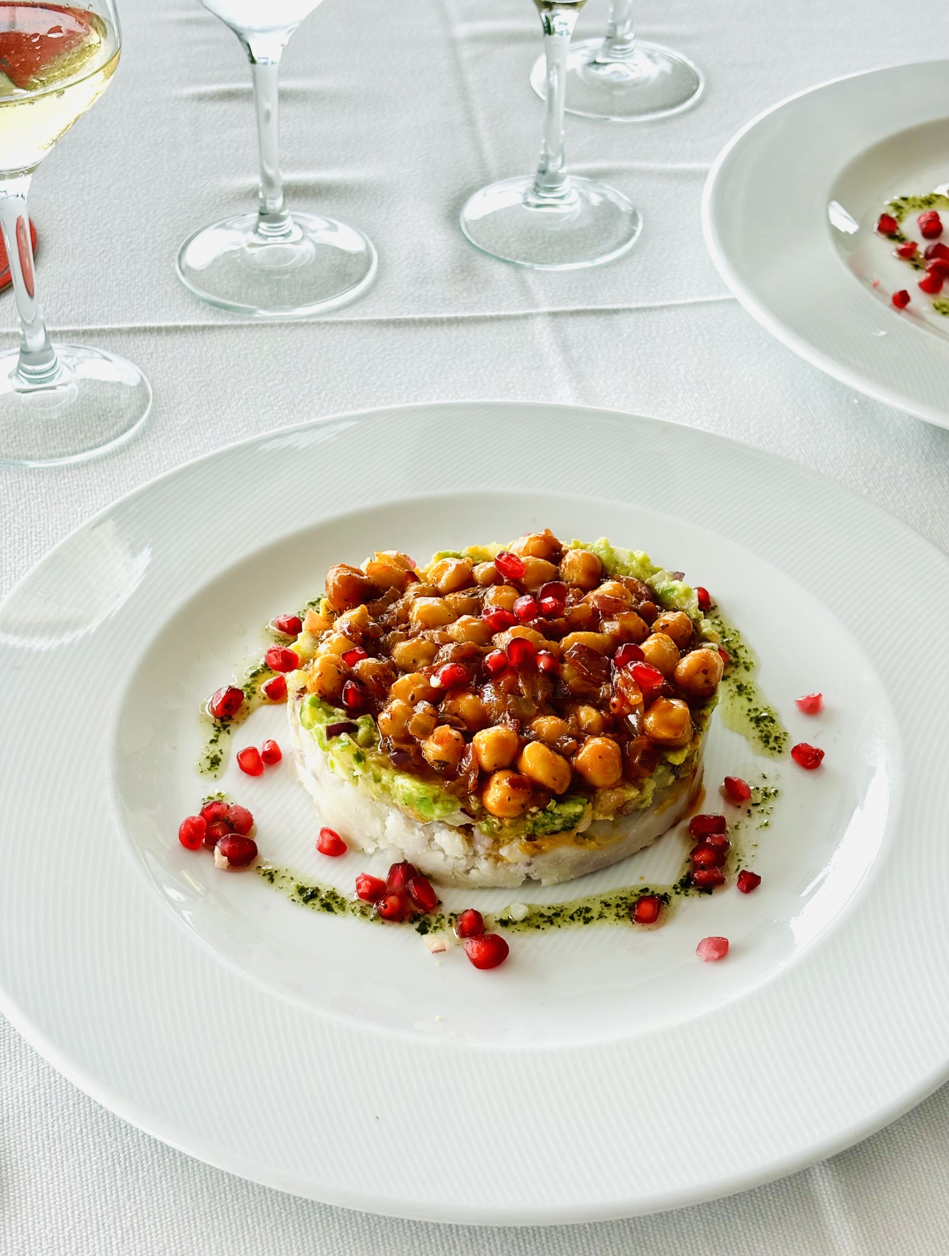 Tym razem, nauczeni doświadczeniem, wzięliśmy tylko carpaccio z tuńczyka, krem z batatów z ciecierzycą i granatem oraz ananas na deser. Co ciekawe, wiosną krem z batatów z ciecierzycą i granatem powstaje z batatów o pomarańczowym miąższu, a jesienią – z białych.