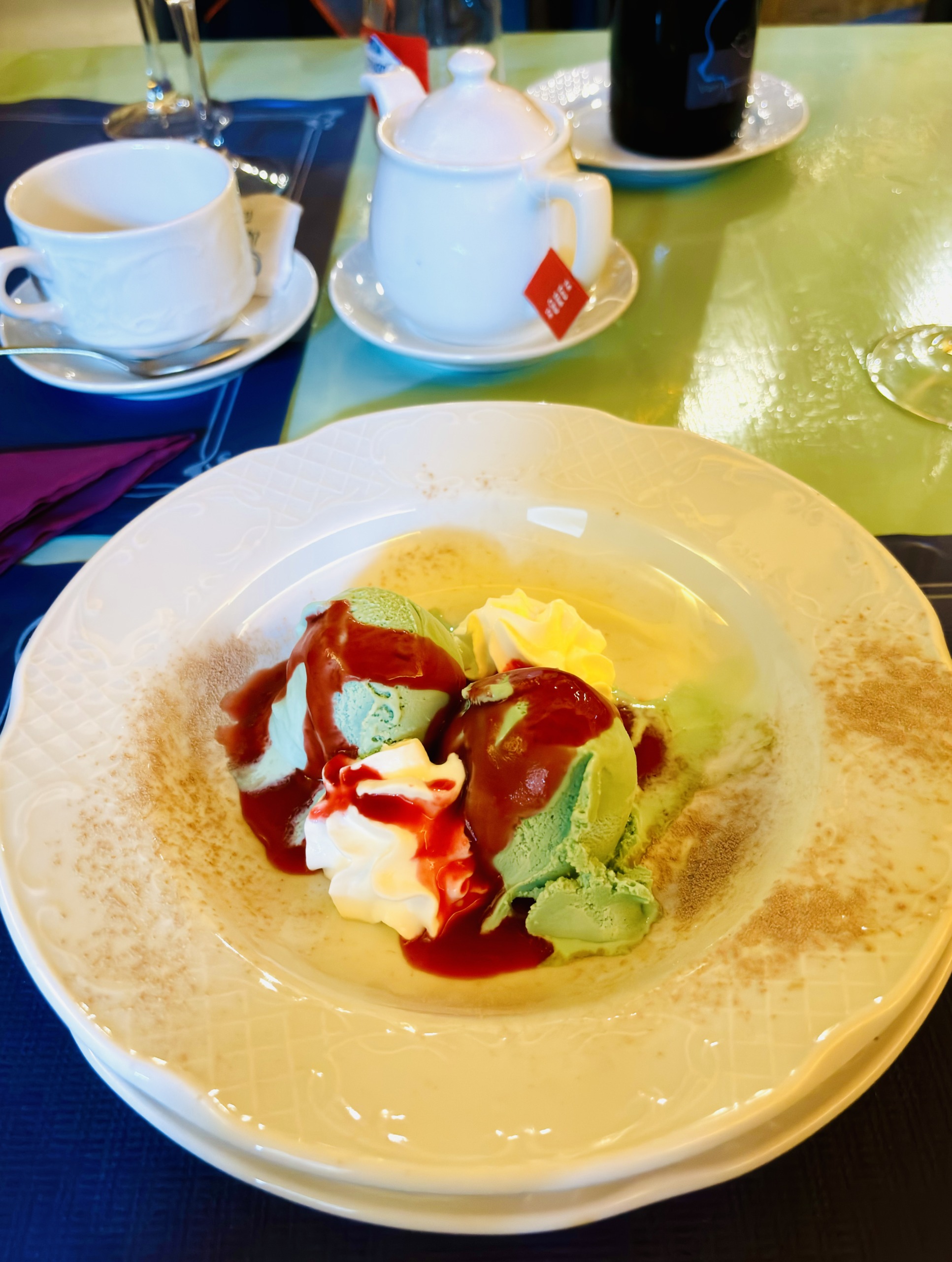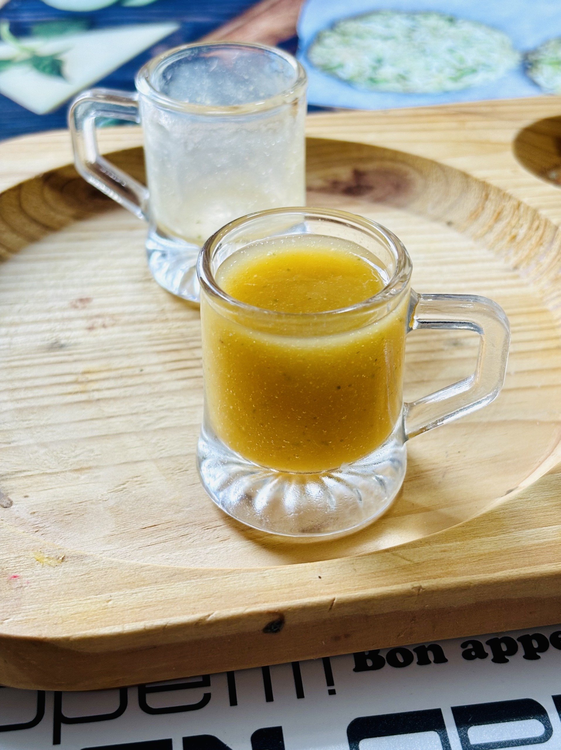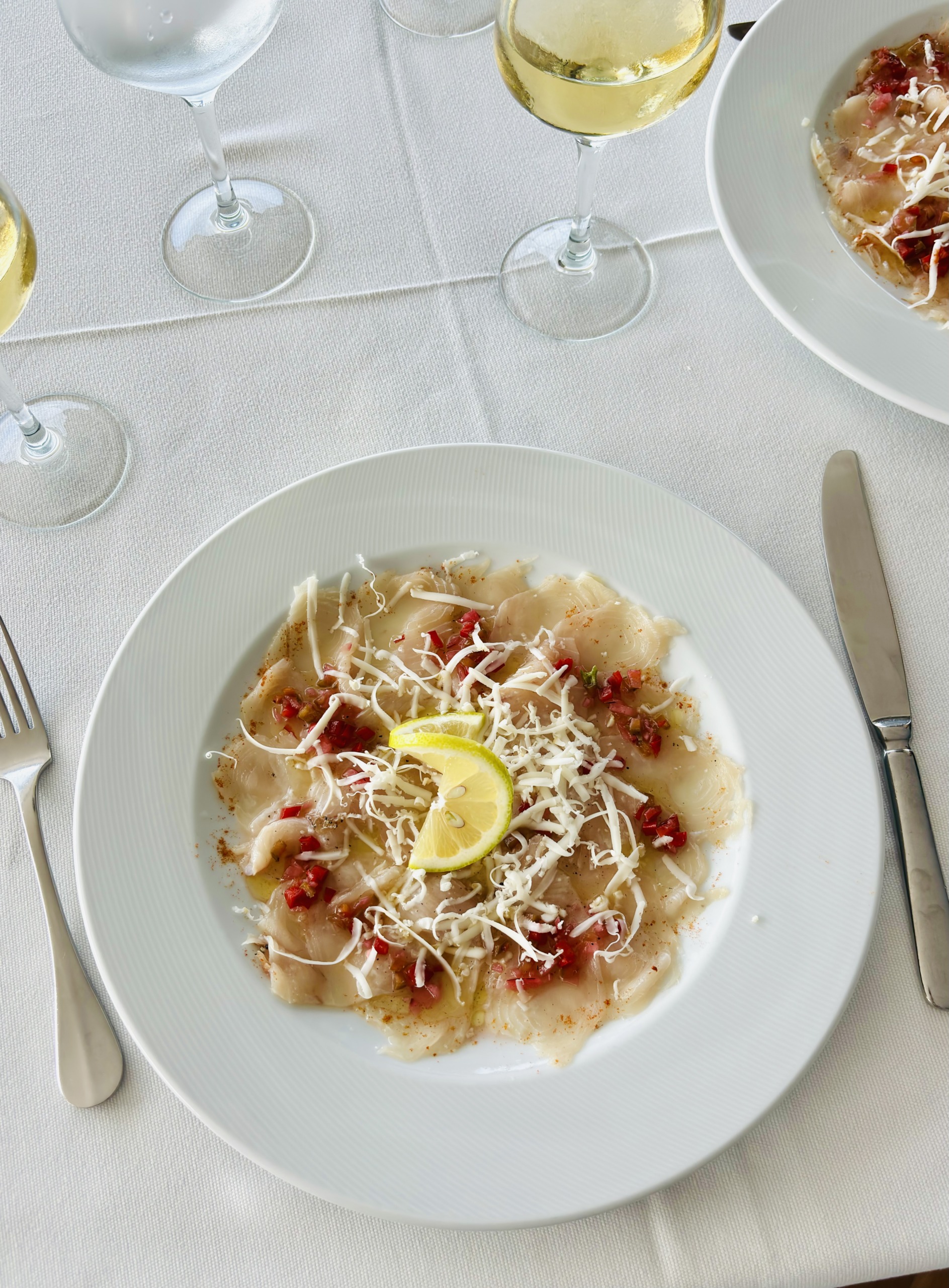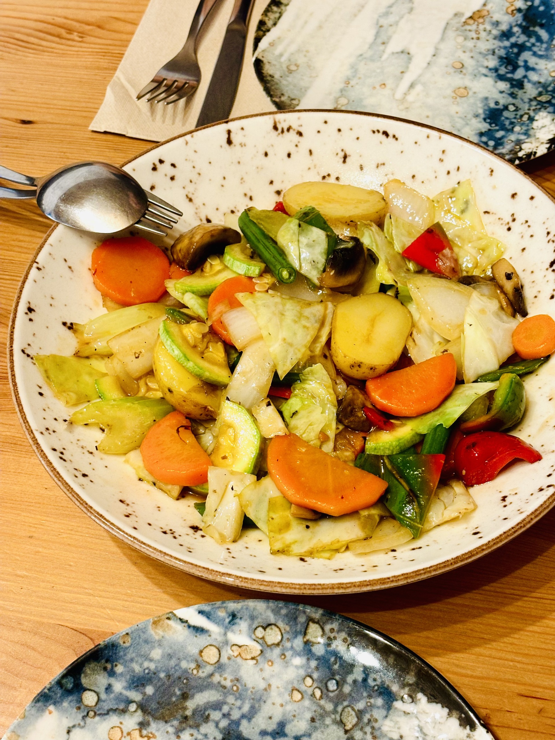 Tym razem, nauczeni doświadczeniem, wzięliśmy tylko carpaccio z tuńczyka, krem z batatów z ciecierzycą i granatem oraz ananas na deser. Co ciekawe, wiosną krem z batatów z ciecierzycą i granatem powstaje z batatów o pomarańczowym miąższu, a jesienią – z białych.