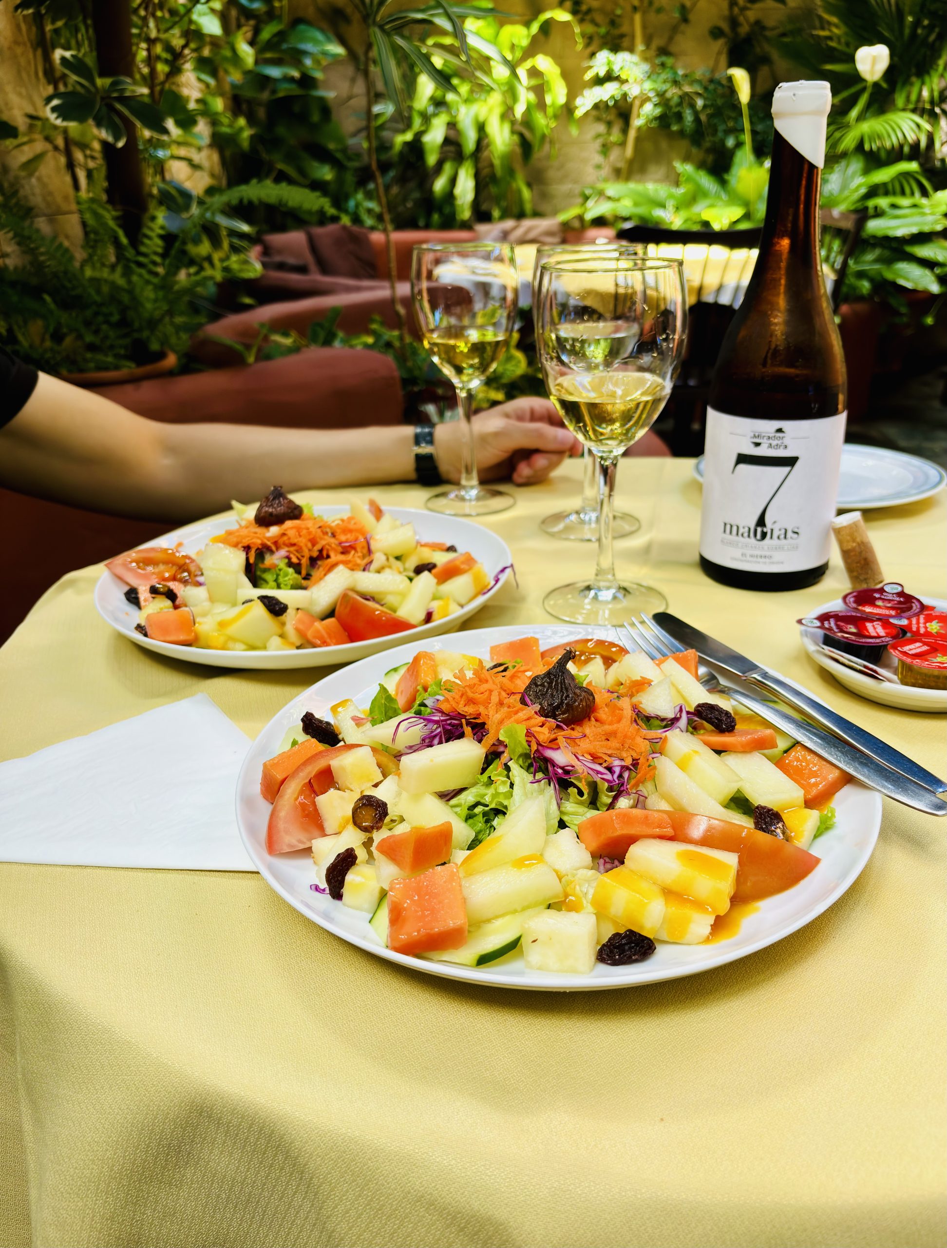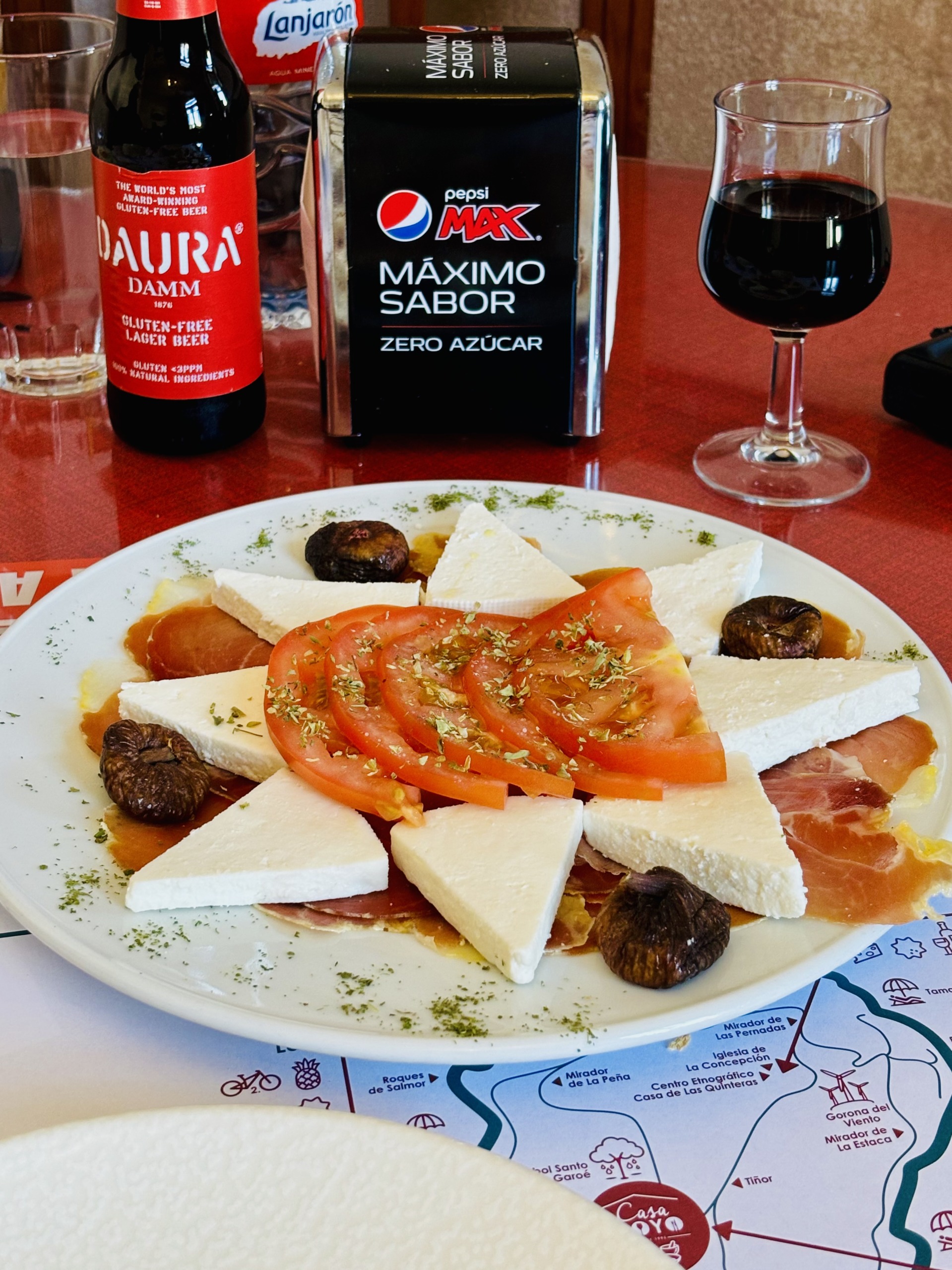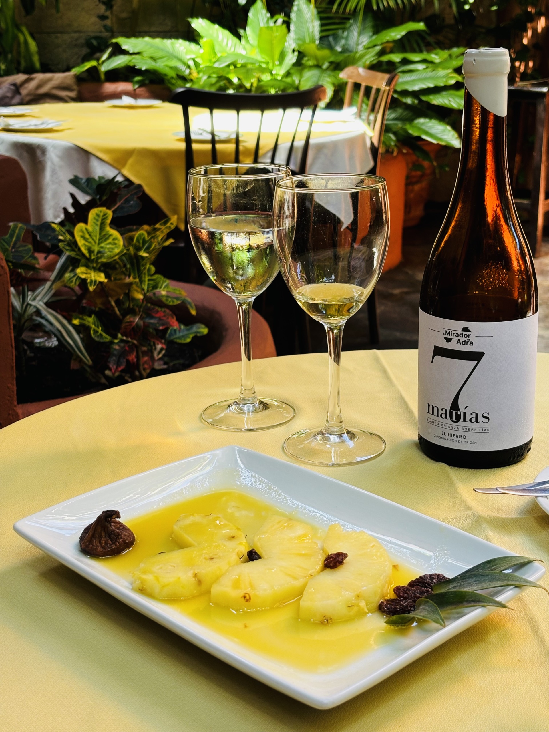 O restauracji przy punkcie widokowym Mirador de La Peña, zaprojektowanym przez César Manrique’a, więcej przeczytasz w tym wpisie. To drugi paśnik de luxe, położony na wyspie najbliżej naszej wakacyjnej chatki w Guarazoca, dlatego jemy tu dość często. W luźniejszy poranek fajnie jest przyjechać do Miradora na kawę z widokiem na ocean, a wieczorem – na wino, nawet bez regularnej kolacji, choć kolacja również jest więcej niż wskazana. Nasze ulubione przeboje Mirador de la Peña to, między innymi, carpaccio z tuńczyka, znakomita zupa jajeczna caldo de huevo, boniatos rellenos con garbanzos y granada, gulasz z królika, duży półmisek grillowanych sezonowych warzyw, zestaw serów z El Hierro (z queso Herreño na czele) i świeży ananas na deser, który jest równie mały i pyszny, co ananasy z Azorów. Zamawiając, warto uważać na takie drobiazgi jak na przykład fakt, że jedna zamówiona ryba oznacza w praktyce porcję złożoną z dwóch ryb, które podawane są z dodatkową miseczką papas arrugadas… Lepiej w związku z tym nie zamawiać oddzielnej porcji tych samych ziemniaków, która również do małych nie należy… Potraw bezglutenowych jest naprawdę sporo, wystarczy poprosić o listę alergenów, która uwzględnia wszystkie dania z karty, i wybrać to, na co mamy ochotę.