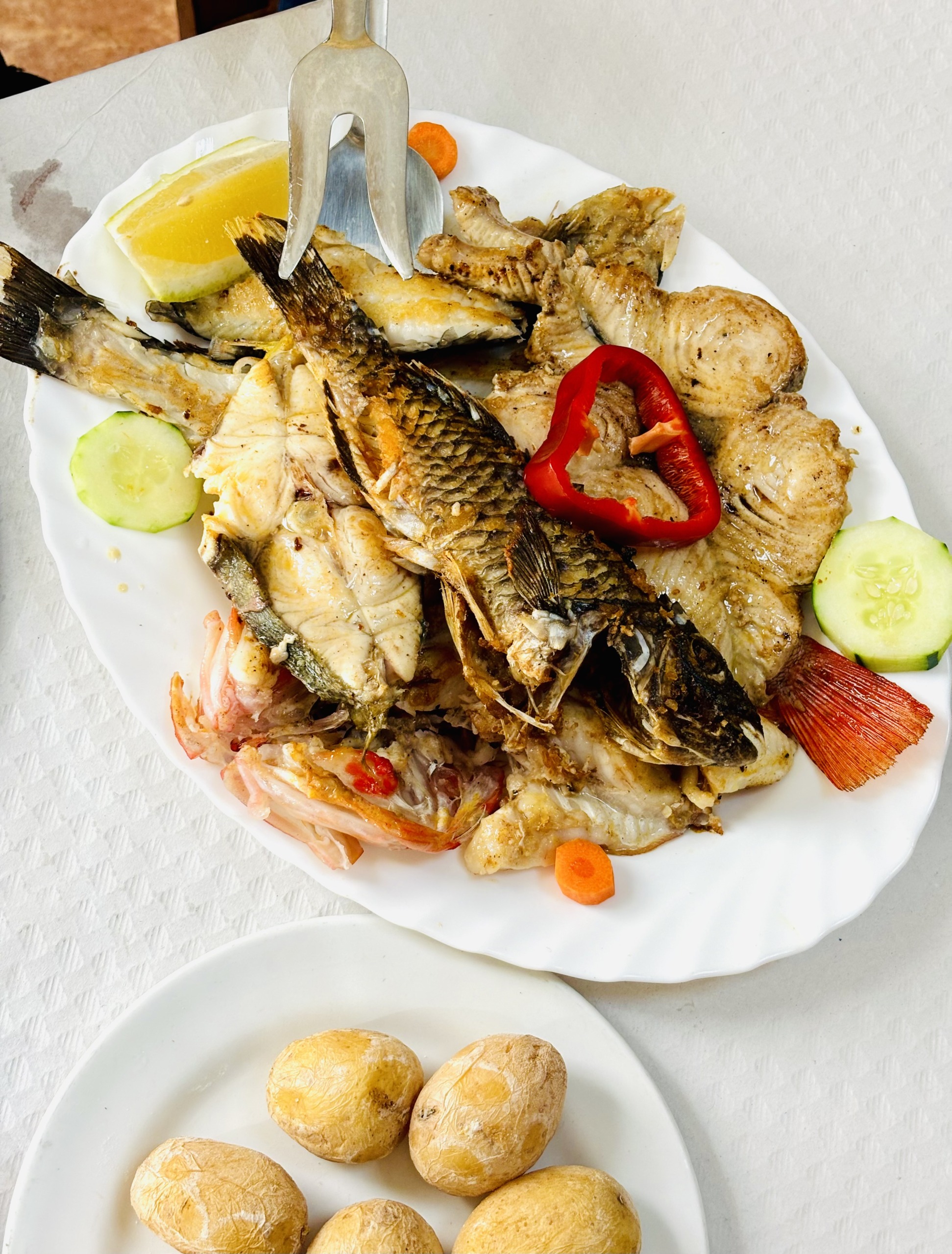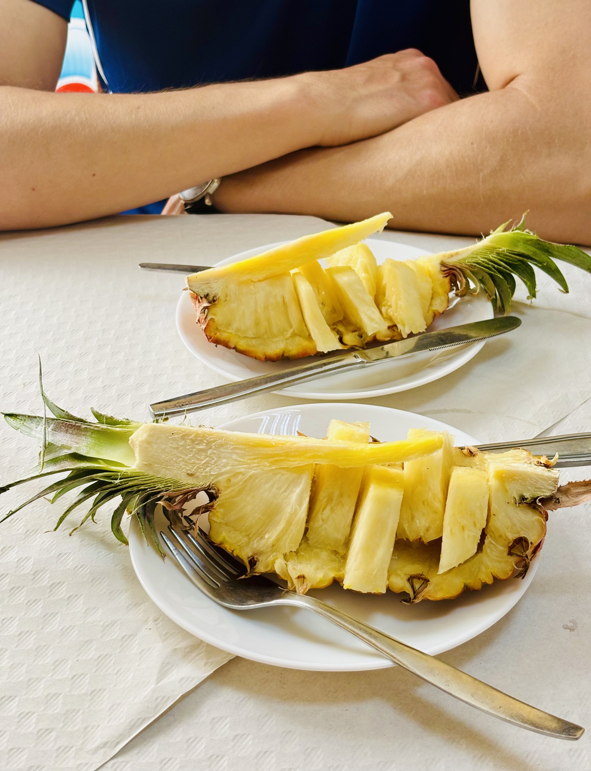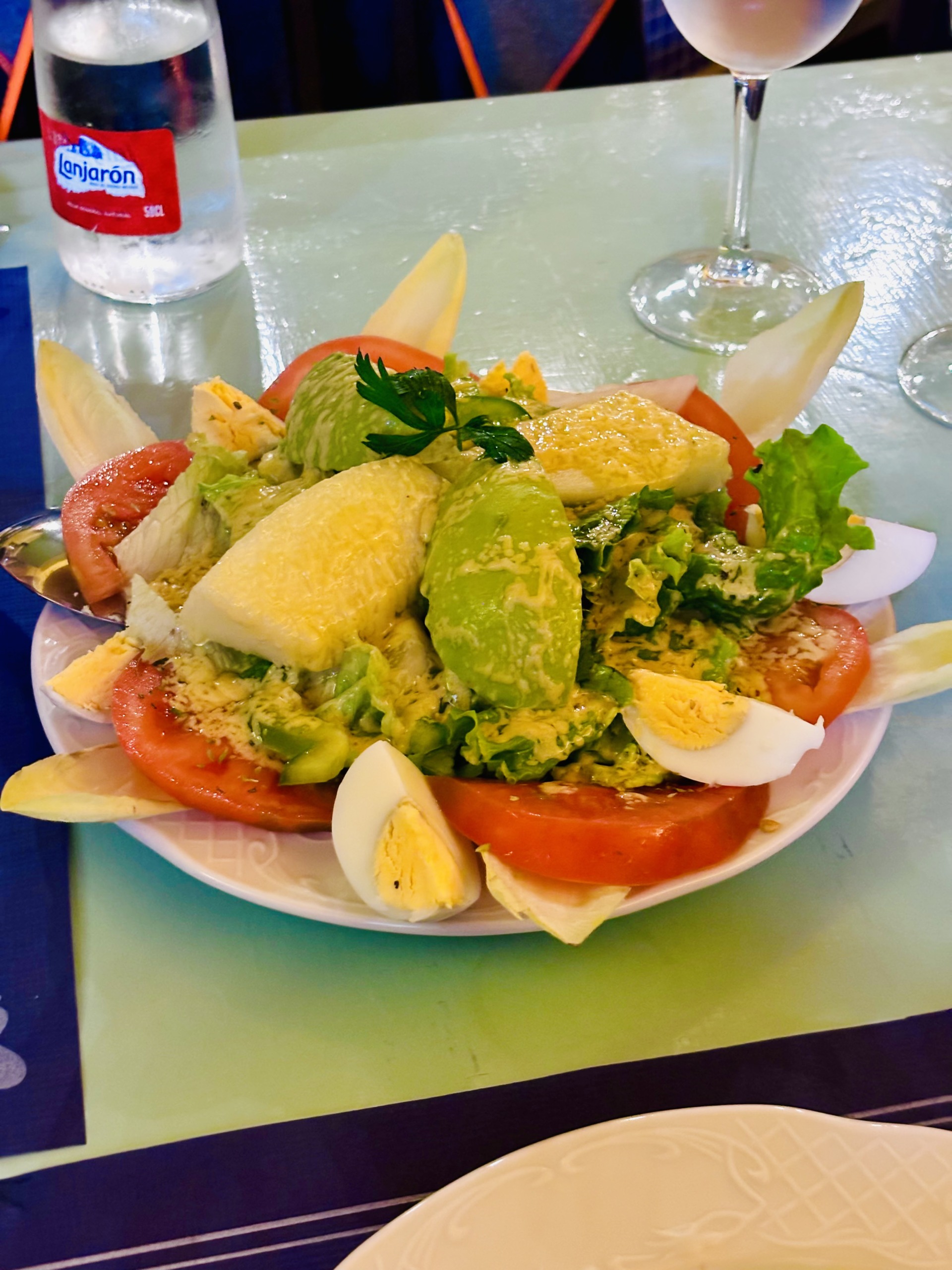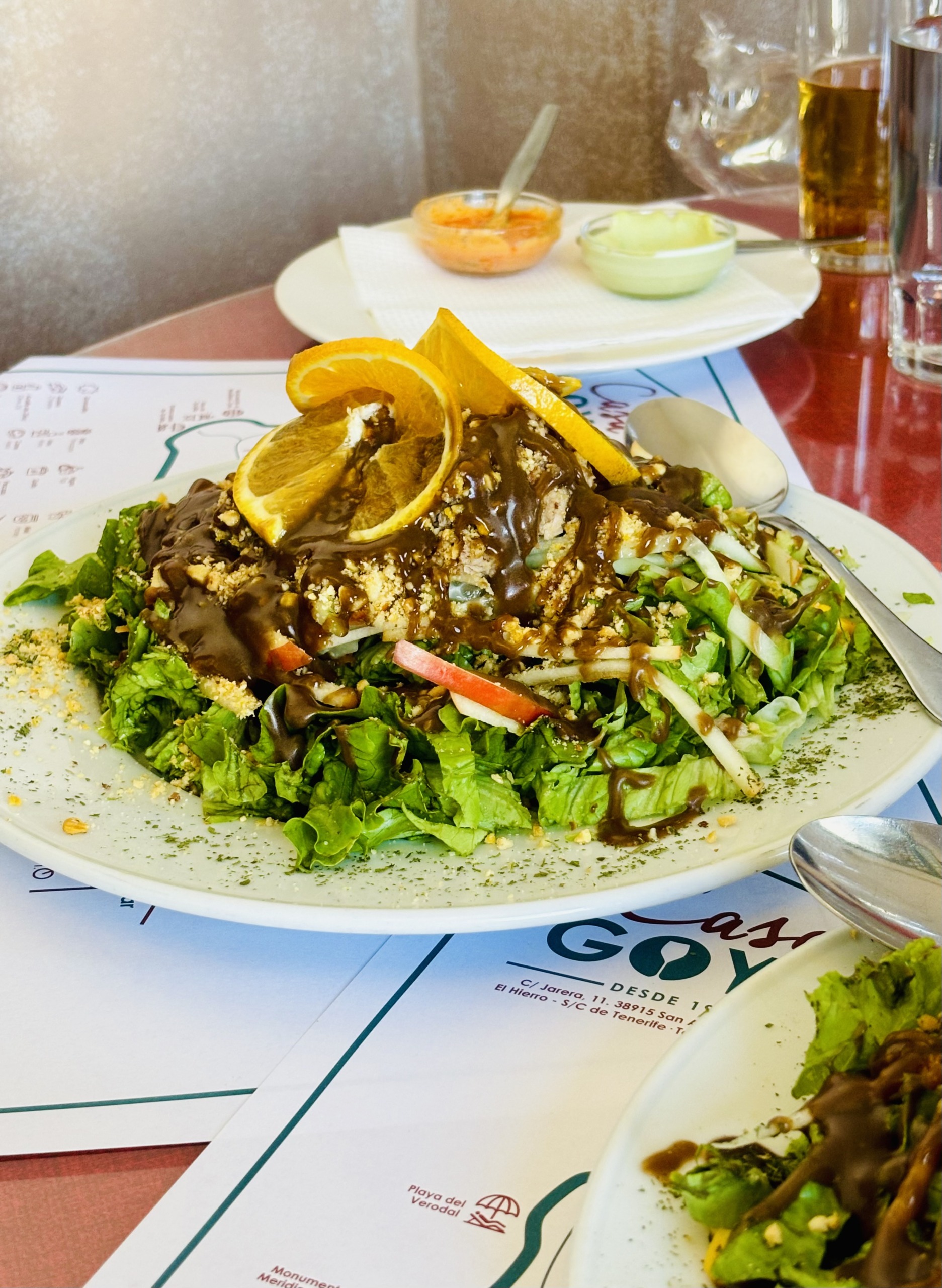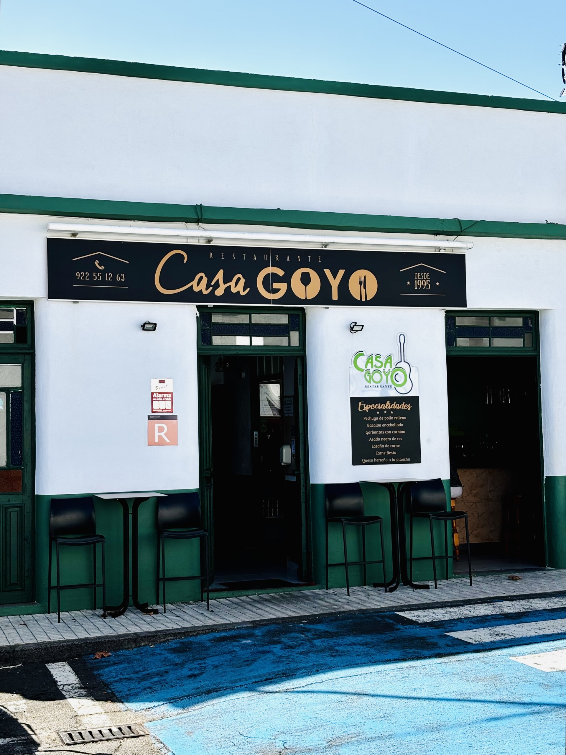 Casa Goyo to bardzo popularna wśród lokalsów tradycyjna rodzinna restauracja w San Andrés, która jako jedyna na wyspie (stan na rok 2024) jest oznaczona bezglutenowym certyfikatem SINGLU10. To również jedno z tych miejsc, w których obsługa darzy gości umiarkowanym zaufaniem, jeżeli chodzi o ilość zamówionego jedzenia. Przykładowo, poprosiliśmy o dwie porcje smażonego sera Herreño, a dostaliśmy jedną do podziału i, faktycznie, wystarczyła. Do tego dwie gigantyczne sałatki z przedziwnym sosem, o którego skład baliśmy się zapytać. Sałatka nazywa się Volcan, a sos musiał zawierać jakiś syrop, ponieważ był słodki. Następnym razem zostaniemy przy serze 😂