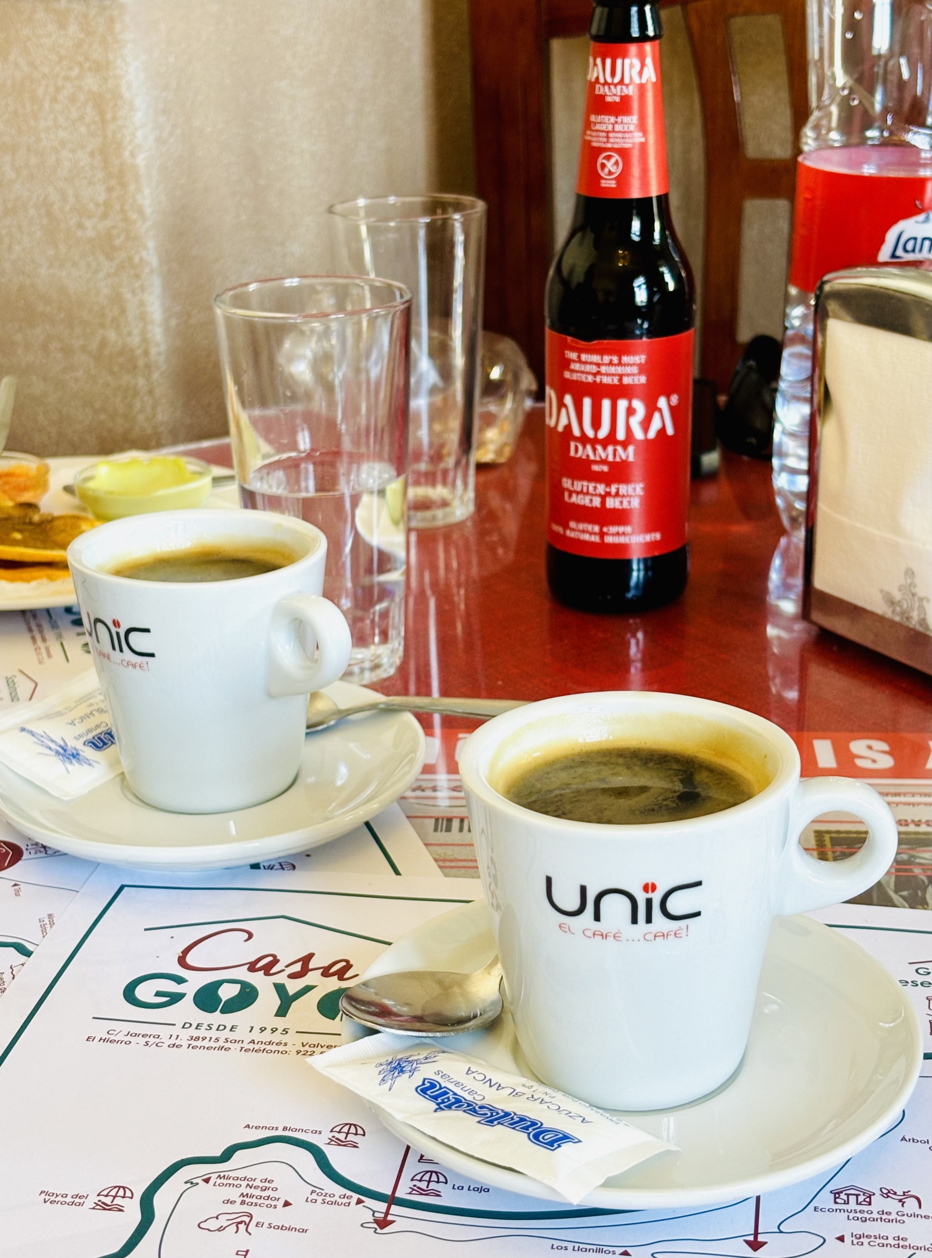 La Casa Abajo to super śniadaniownia w La Frontera, która serwuje przede wszystkim bocadillos w kilkunastu wariantach. Za pierwszym razem, w czerwcu 2024, wpadliśmy tu na kwadrans przed zamknięciem (działa od 7:00 do 13:00) tylko na kawę i herbatę (pyszne). Właściciel zadeklarował, że jeśli pojawimy się następnego dnia, dostaniemy podpiekane kanapki bez glutenu. I faktycznie, jak obiecał, tak zrobił. Kupił chleb bg, zrobił pyszne kanapki z serem Herreño i miodem, a kolejnego dnia z Herreño i warzywami. Co więcej, bezglutenowe kanapki weszły na stałe do menu – kiedy wróciliśmy na El Hierro w październiku 2024, nadal były dostępne. Taka właśnie jest ta wyspa – niesamowicie gościnna!