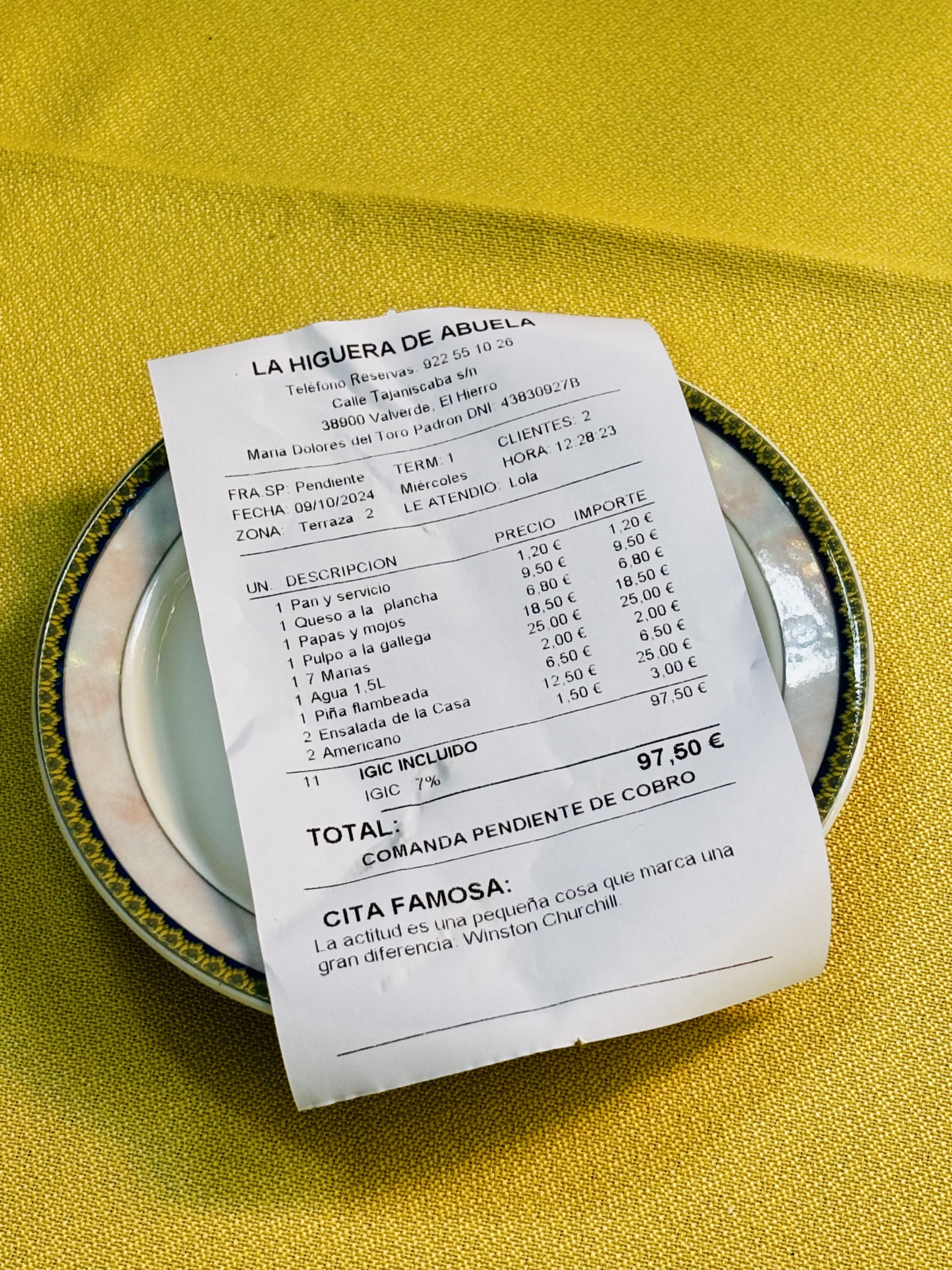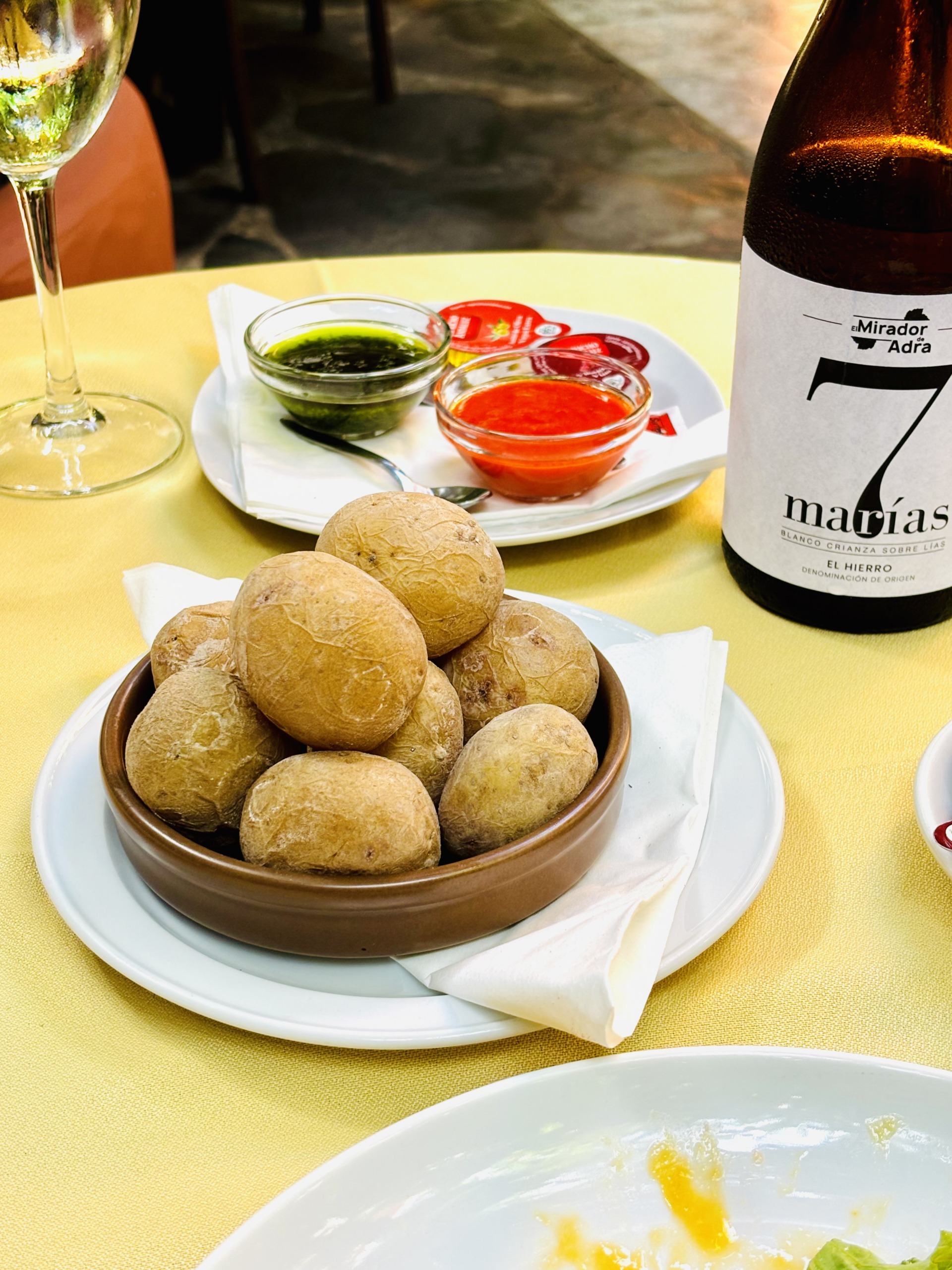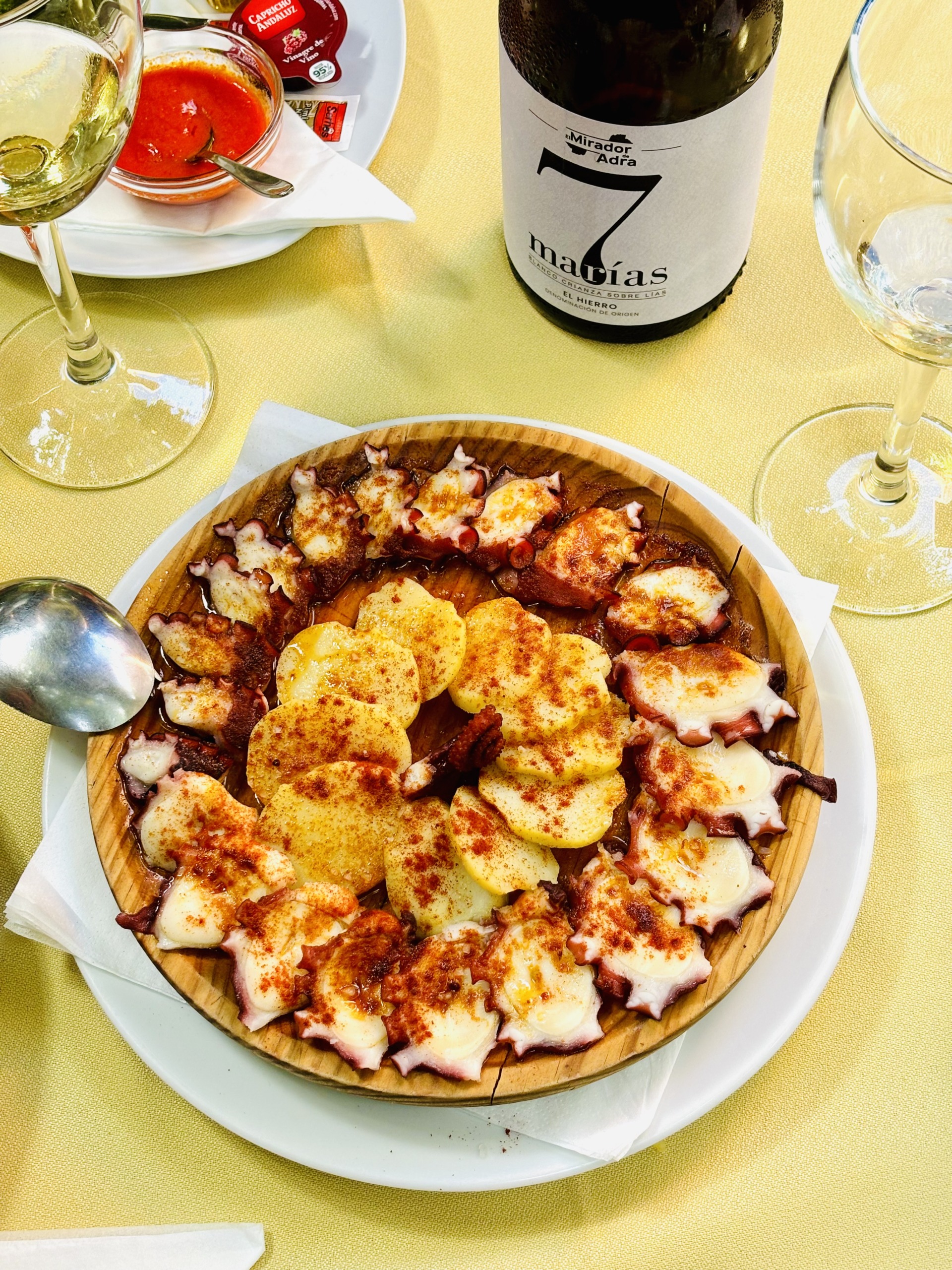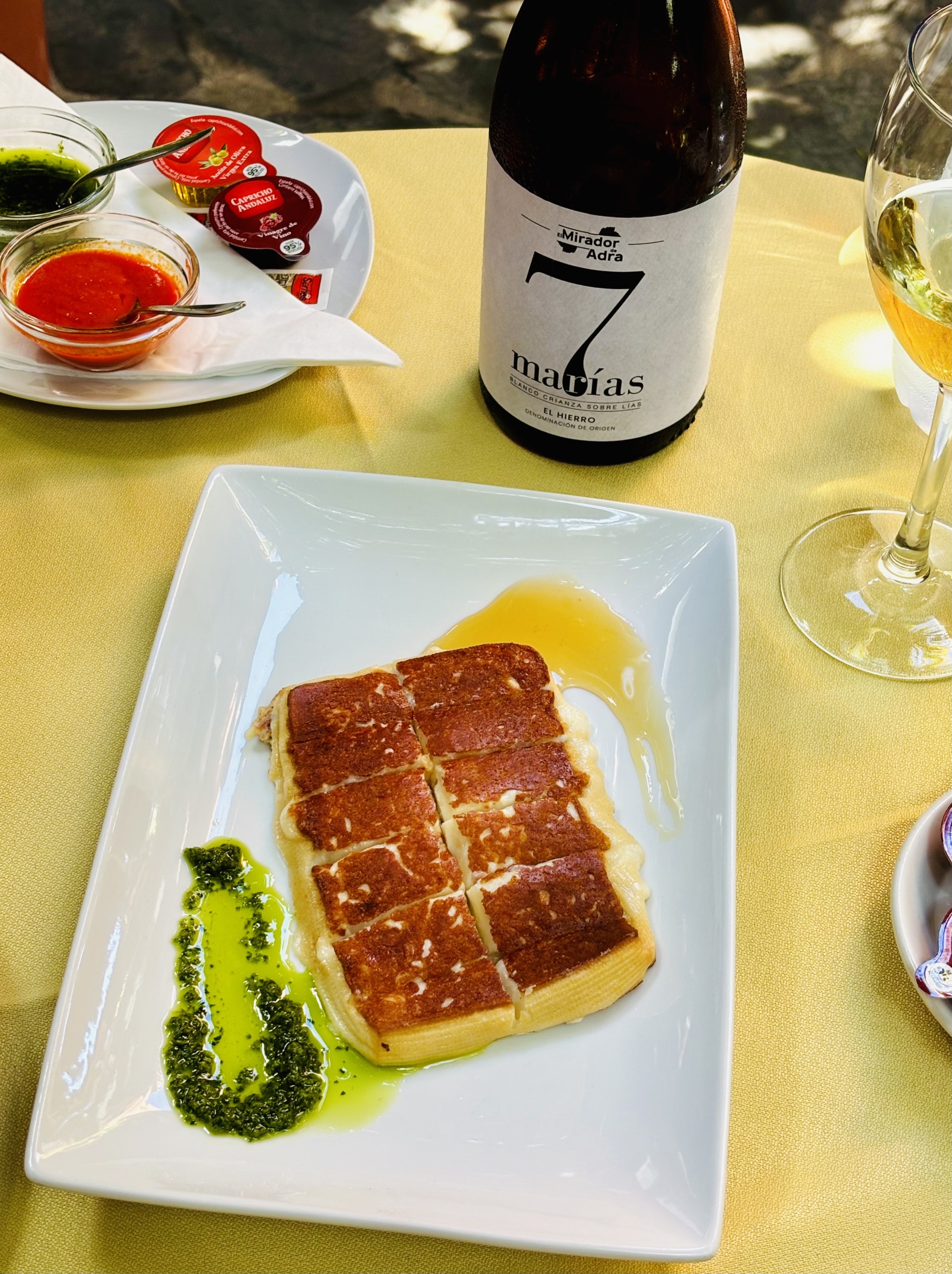 La Higuera de Abuela to urocza restauracyjka w Echedo, która działa tylko w najcieplejsze miesiące, to jest od czerwca do października. Menu wypełniają tu pyszne sezonowe jedzonka, a porcje – tradycyjnie na El Hierro – są przeogromne. We dwójkę najedliśmy się ledwie pięcioma przystawkami (każda to trafiony zatopiony!), a deserowy ananas z lokalnych upraw na wyspie był już tylko z łakomstwa. Bardzo dobry wybór win, niezwykle serdeczna obsługa i przytulny wystrój pełen roślin. Z przyjemnością zjemy tu ponownie przy najbliższej okazji. Na stole: sałatki, papas arrugadas (ziemniaki w soli), Herreño a la plancha (smażony ser Herreño z koziego mleka), pulpo a la gallega (ośmiornica po galicyjsku), piña flambeada (flambirowany ananas) i butelka wina El Mirador de Adra 7 Marias, o której limitowanej edycji pisaliśmy tutaj.