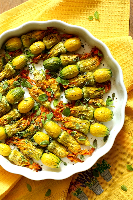 Kwiaty cukinii i dyni nadziewane i zapiekane z owczym serem i oliwkami