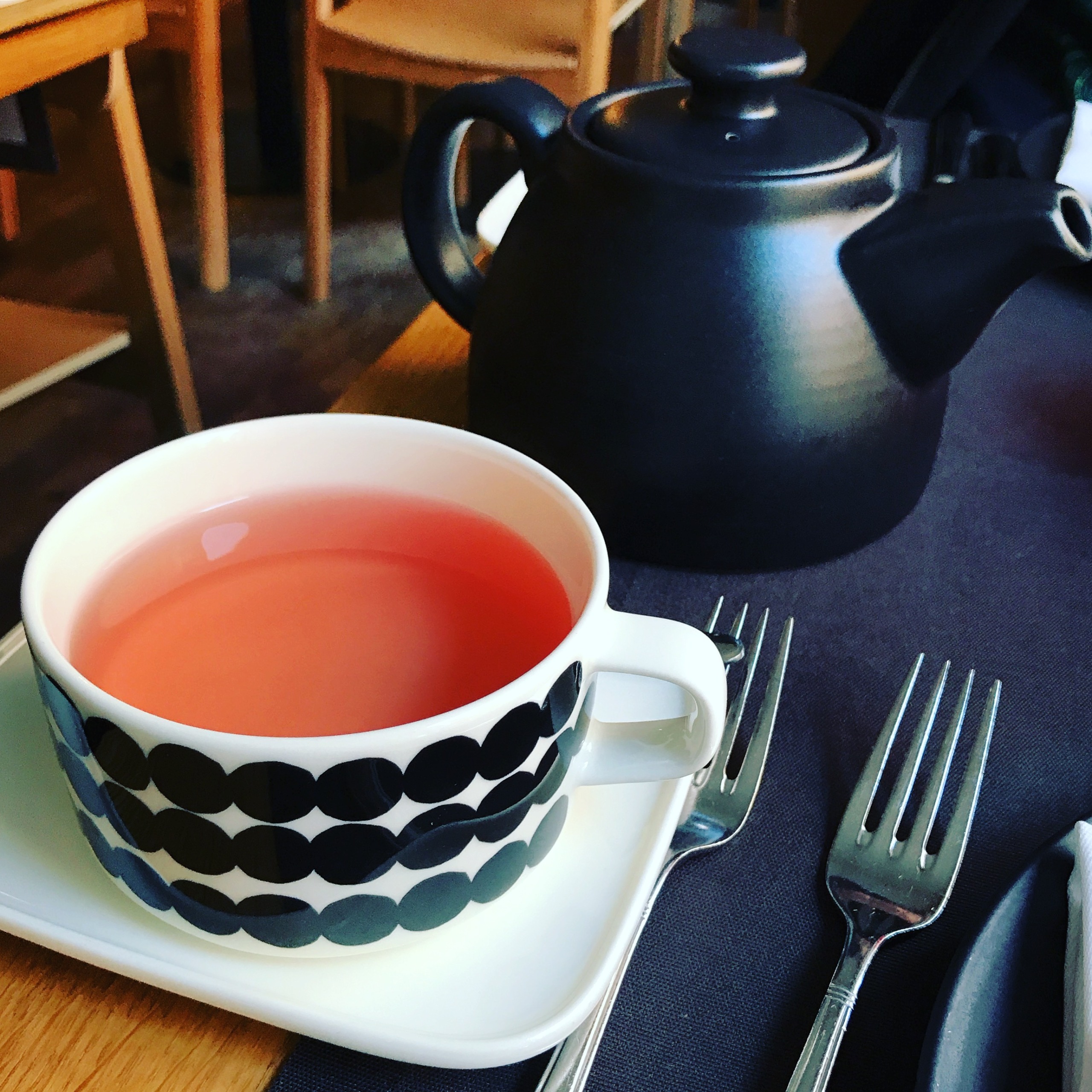 Biała herbata aromatyzowana i koloryzowana burakiem (7 EUR) podana ze słoiczkiem miodu jako słodzidłem
