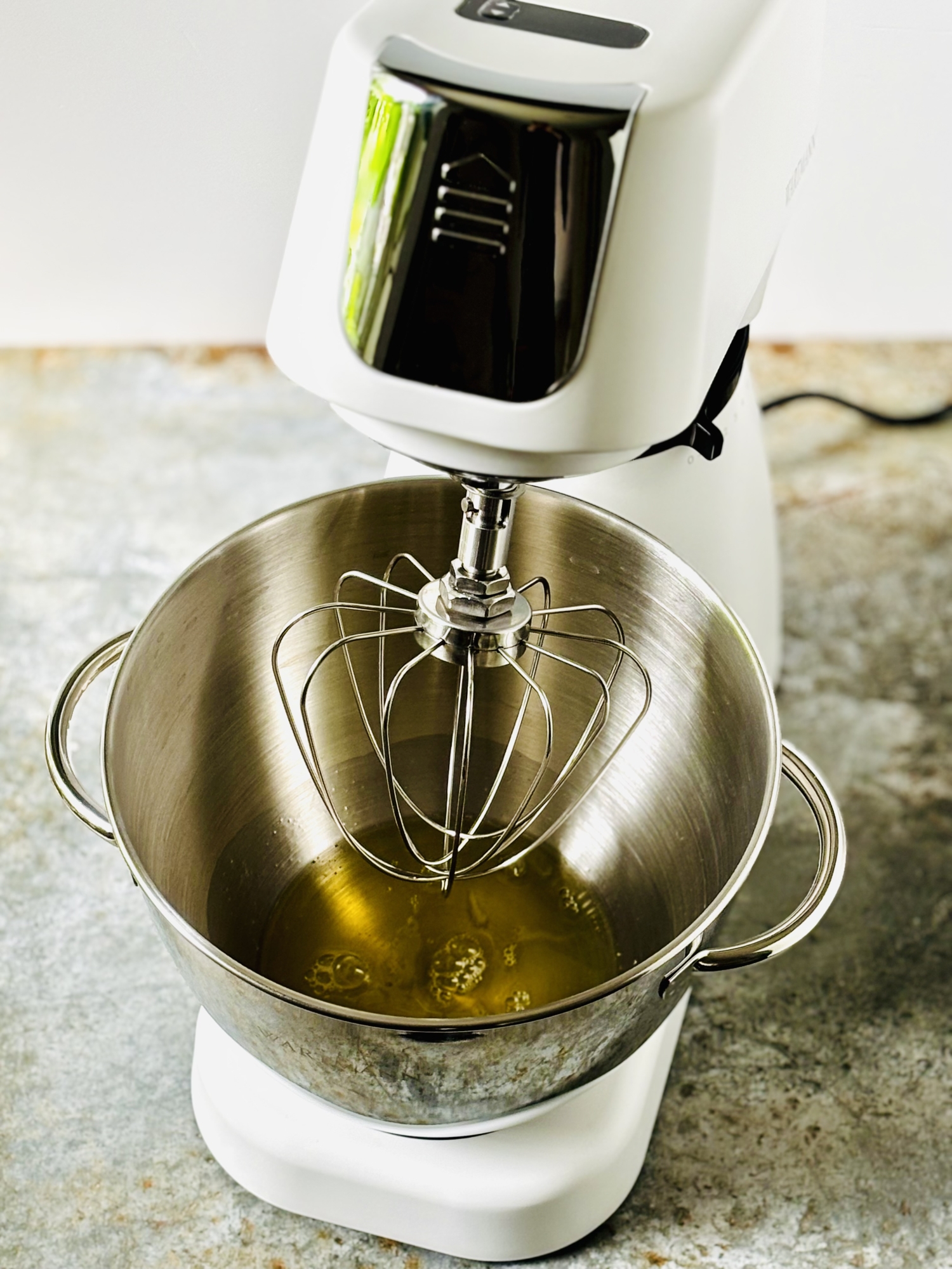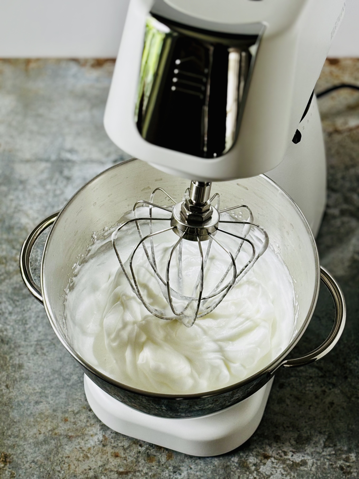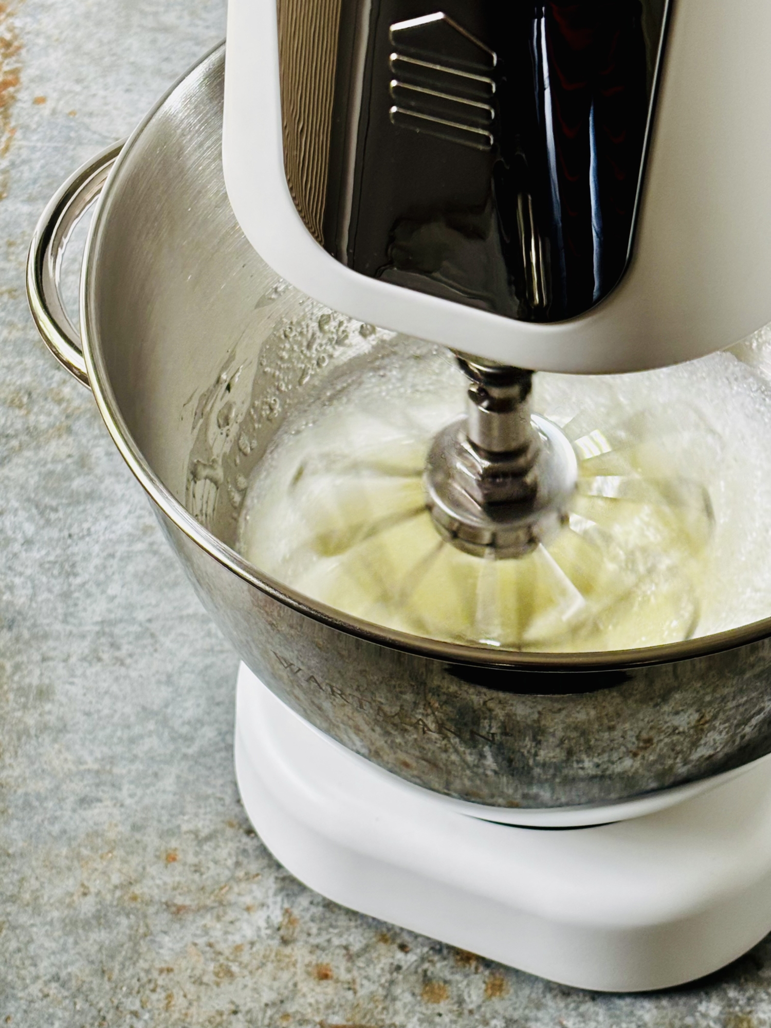 - Białka wraz ze szczyptą soli ubij na sztywną pianę (używam miksera planetarnego Wartmann, ubijanie – poziom 6), a następnie dodaj ją do ciasta i delikatnie wymieszaj całość silikonową łopatką.