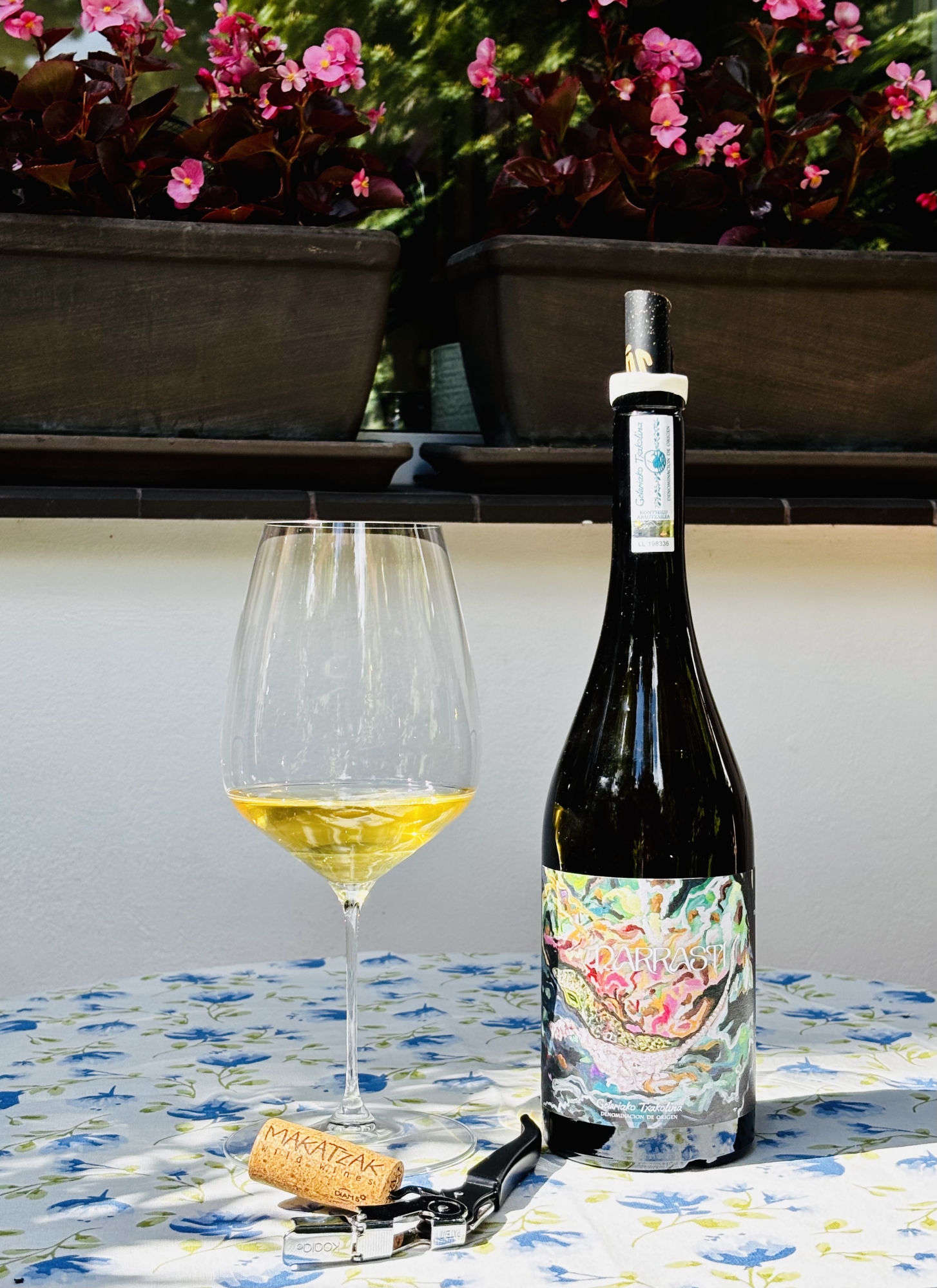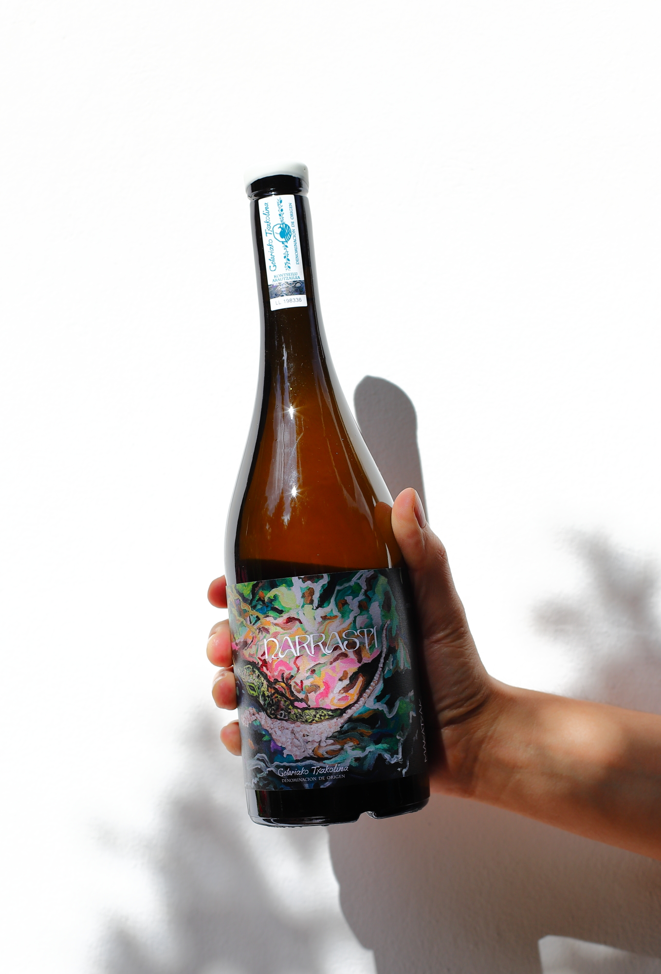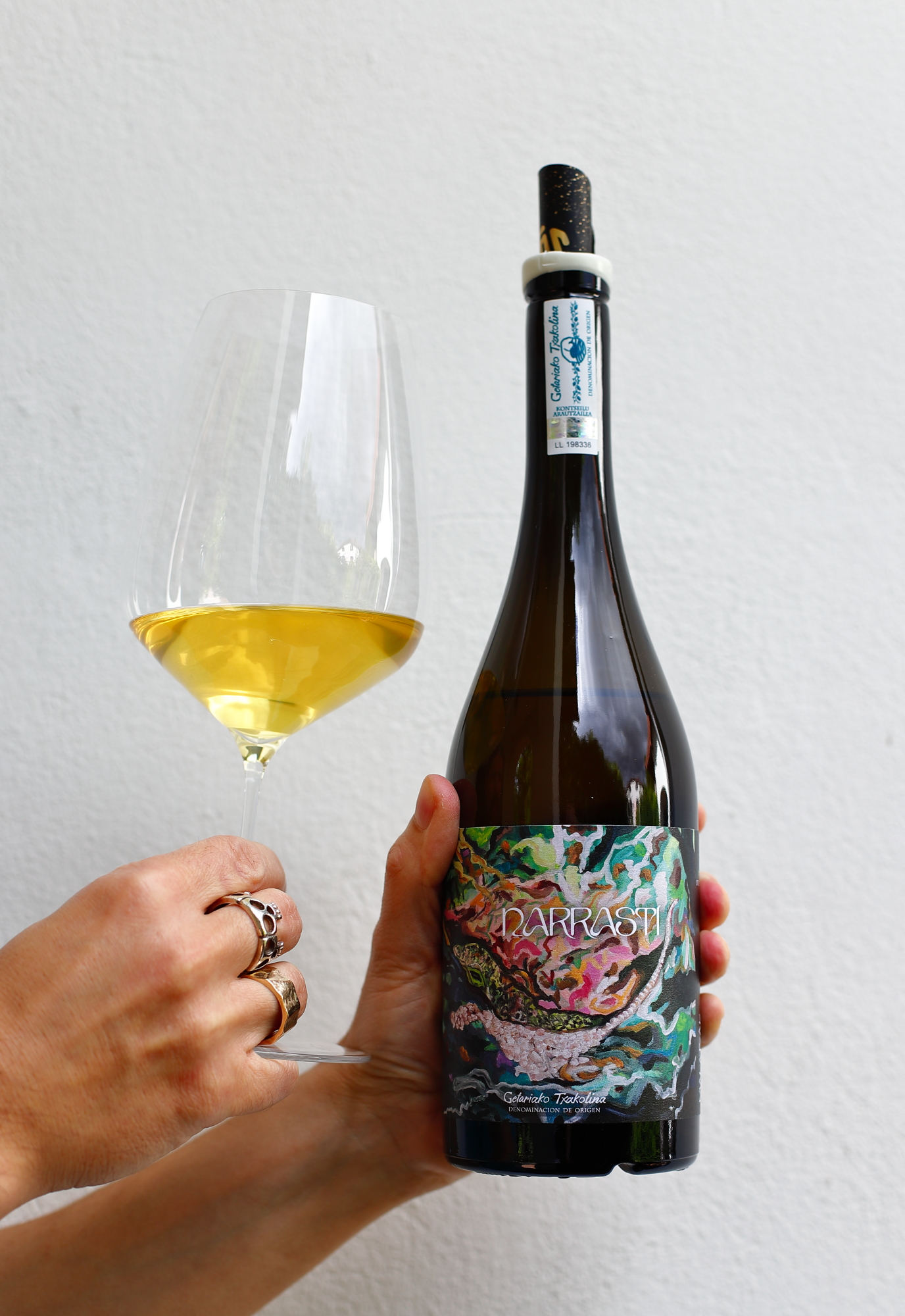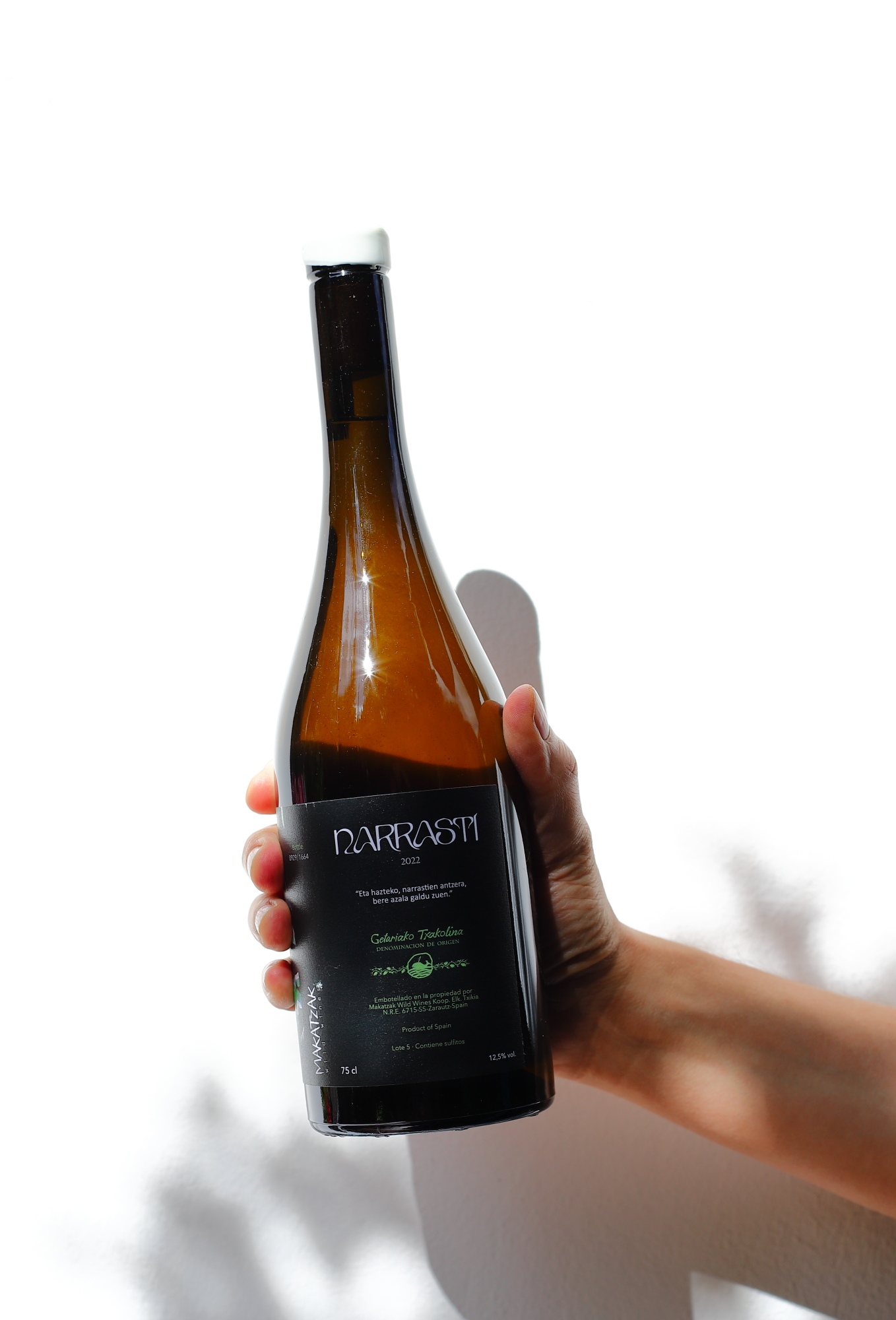Narrasti w euskarze, czyli w języku baskijskim, znaczy tyle, co „gad”, więc sama nazwa może już sugerować co nieco w przedmiocie charakteru wina. Makatzak Narrasti to pełne życia, charakterne txakoli, które wymyka się stereotypom. Powstaje w 90% z Hondarrabi Zuri i w 10% z Hondarrabi Zuri Zerratia, dwóch endemicznych odmian, uprawianych w Sorgintxulo w Aia (Gipuzkoa), w dziko zielonym zakątku nad brzegiem Atlantyku. Winnica prowadzona jest organicznie i biodynamicznie, w warunkach różnorodności biologicznej, a winorośle rosną na glebach gliniasto-wapiennych z żyłami łupku, co zapewnia txakoli jego unikalną, niepodrabialną mineralność. Proces winifikacji w skrócie: ręczny zbiór do małych skrzynek, 90% gron jest tłoczonych od razu i fermentowanych spontanicznie na naturalnych drożdżach, a pozostałe 10% maceruje ze skórkami przez trzy tygodnie, co nadaje winu głębszą, bardziej złożoną strukturę. Nic nie jest klarowane ani filtrowane, podczas butelkowania czasem dodawana jest tylko niewielka ilość siarki. Dojrzewanie trwa około 11 miesięcy i jest dzielone między stalową beczkę, 400-litrową beczkę z francuskiego dębu oraz 225-litrowe gliniane naczynie. Tak powstaje pięknie złożone txakoli, które jednocześnie nie traci nic ze swojej zachwycającej świeżości.