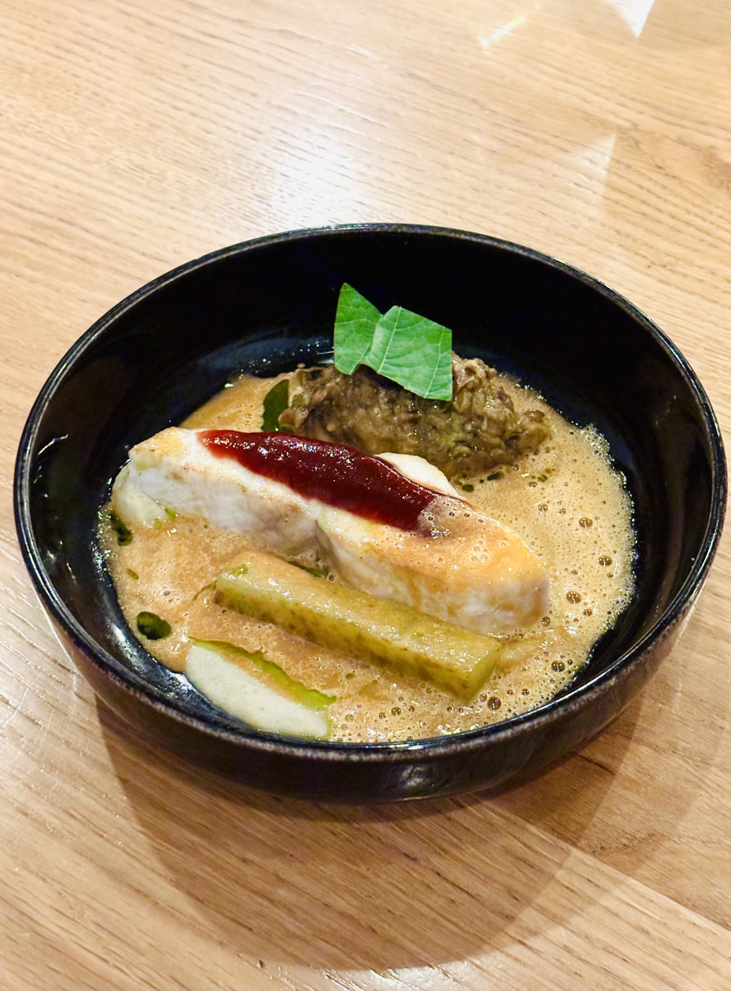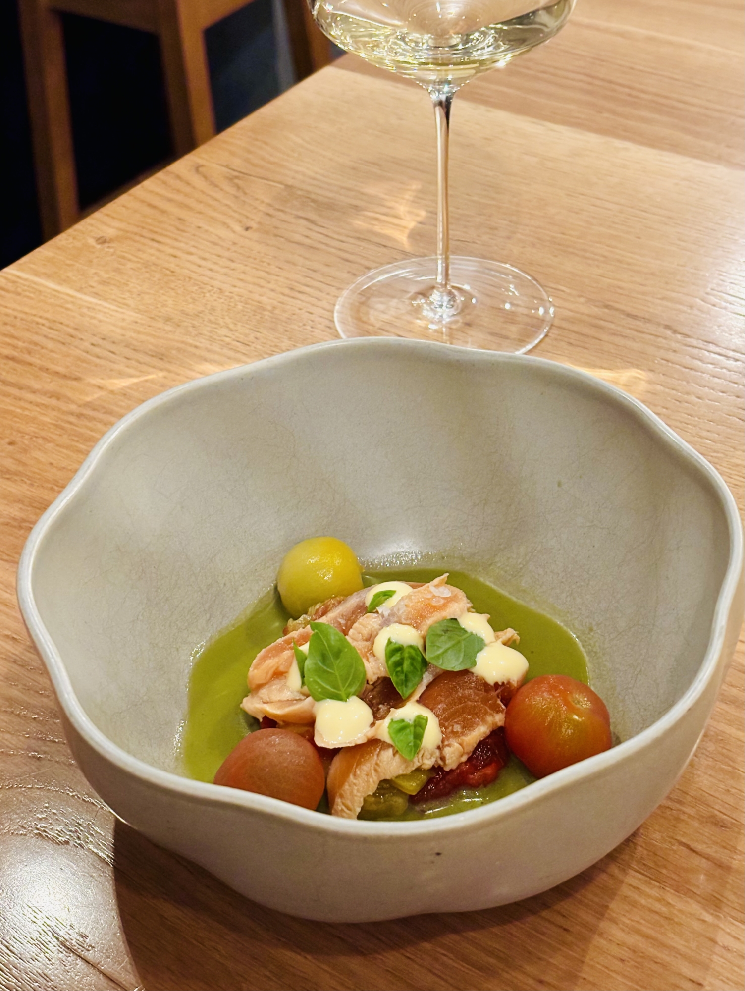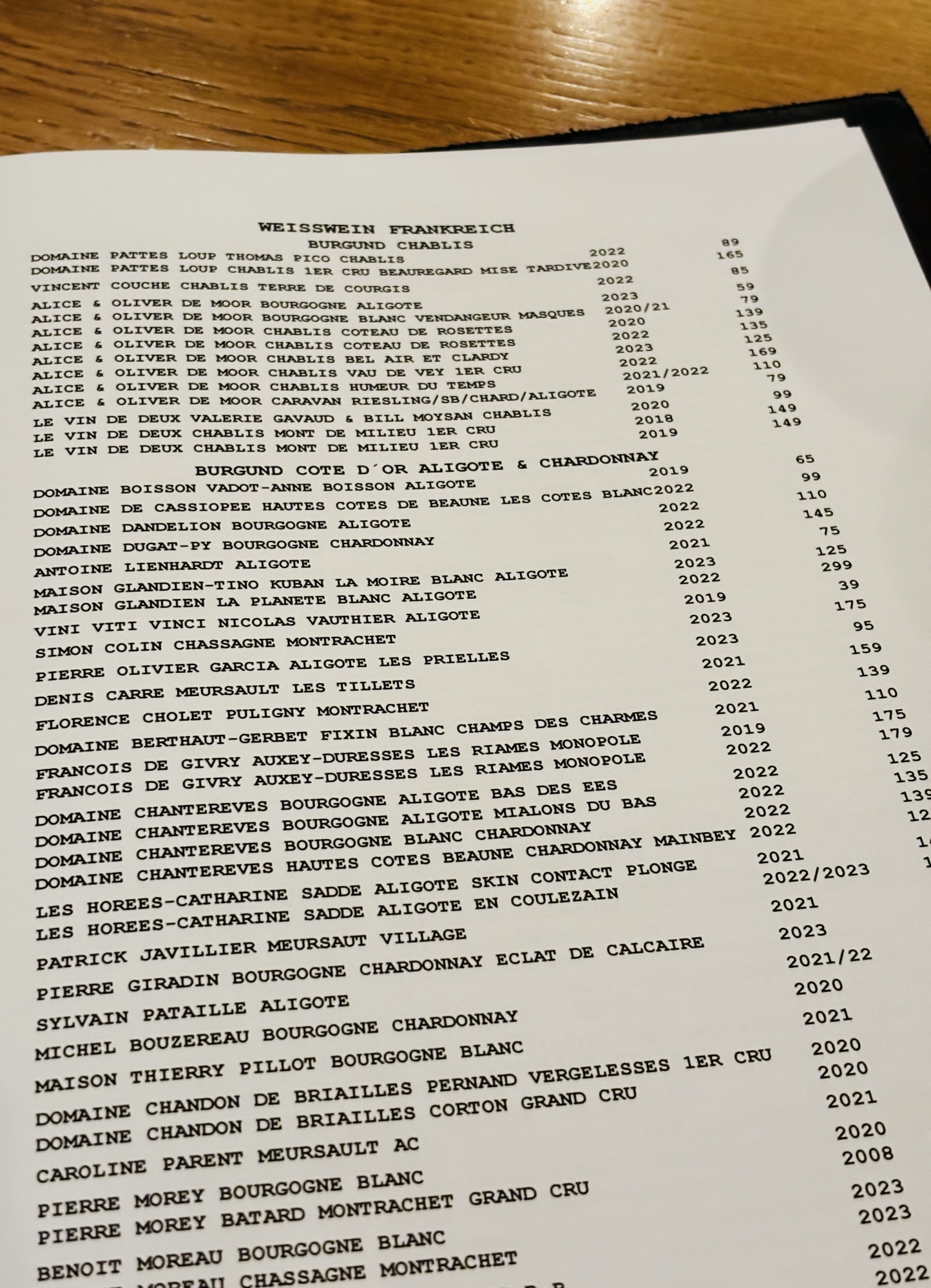 W MAST do wyboru mamy menu degustacyjne lub dania z karty oraz niekończącą się listę win. Jeżeli chodzi o menu degustacyjne, kuchnia od ręki jest w stanie przygotować je w wersji bezglutenowej i z wyłączeniem mięsa, więc skorzystaliśmy z tej opcji (dwa menu degustacyjne bez glutenu, w tym jedno z rybami i owocami morza, a drugie z rybami i mięsem). Co więcej, obsługa informuje również, że każdy zestaw potraw w ramach menu jest inny, dzięki czemu – dzieląc się jedzeniem – próbujemy 12, a nie tylko 6 dań (w praktyce – pierwsze danie dostaliśmy to samo). Na dobry początek wieczoru zamówiliśmy wytrawny cydr ze szwajcarskiej Cidrerie du Vulcain (pyszny), a później butelkę Anne Boisson Bourgogne Aligoté 2019 (kieliszki Mark Thomas). To wspaniałe Aligoté dojrzewające w dębie otwiera się nutami brioszki, prażonej kukurydzy, orzechów laskowych i gorzkich migdałów. W ustach złożone, świeże, cytrusowe, mineralne, o długim i trwałym finiszu. Wino otwierał dla nas Steve Breitzke, co świadczy o tym, że właściciele MAST nie chowają się na zapleczu i wspierają swój zabiegany zespół.