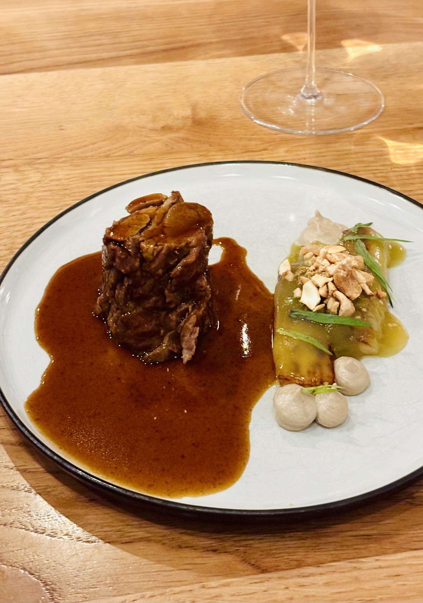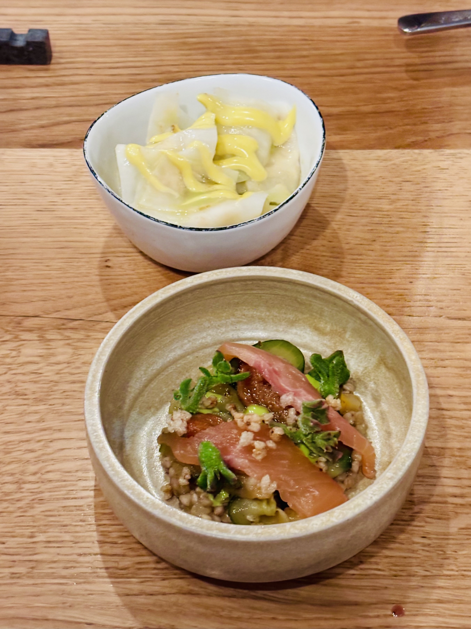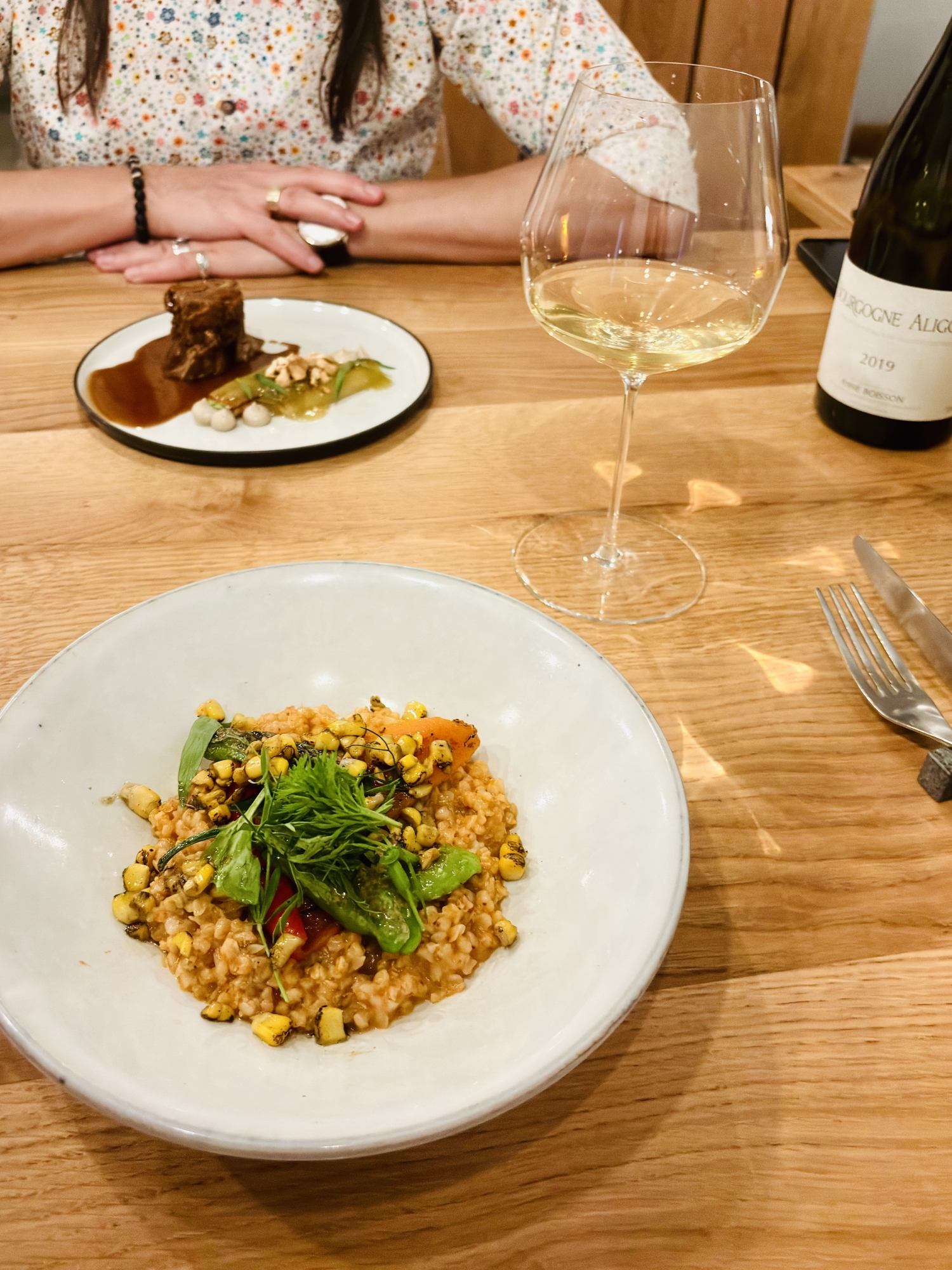 W MAST do wyboru mamy menu degustacyjne lub dania z karty oraz niekończącą się listę win. Jeżeli chodzi o menu degustacyjne, kuchnia od ręki jest w stanie przygotować je w wersji bezglutenowej i z wyłączeniem mięsa, więc skorzystaliśmy z tej opcji (dwa menu degustacyjne bez glutenu, w tym jedno z rybami i owocami morza, a drugie z rybami i mięsem). Co więcej, obsługa informuje również, że każdy zestaw potraw w ramach menu jest inny, dzięki czemu – dzieląc się jedzeniem – próbujemy 12, a nie tylko 6 dań (w praktyce – pierwsze danie dostaliśmy to samo). Na dobry początek wieczoru zamówiliśmy wytrawny cydr ze szwajcarskiej Cidrerie du Vulcain (pyszny), a później butelkę Anne Boisson Bourgogne Aligoté 2019 (kieliszki Mark Thomas). To wspaniałe Aligoté dojrzewające w dębie otwiera się nutami brioszki, prażonej kukurydzy, orzechów laskowych i gorzkich migdałów. W ustach złożone, świeże, cytrusowe, mineralne, o długim i trwałym finiszu. Wino otwierał dla nas Steve Breitzke, co świadczy o tym, że właściciele MAST nie chowają się na zapleczu i wspierają swój zabiegany zespół.