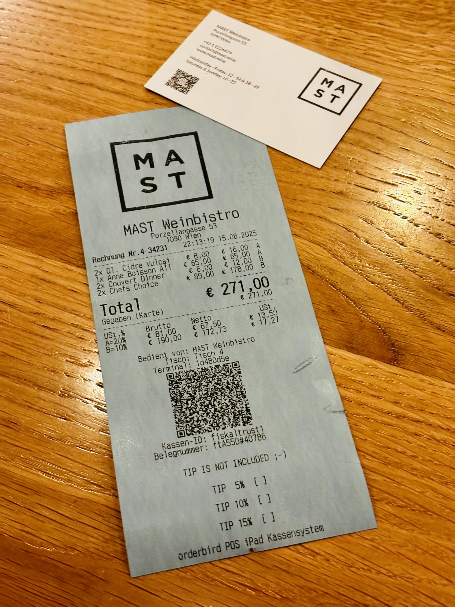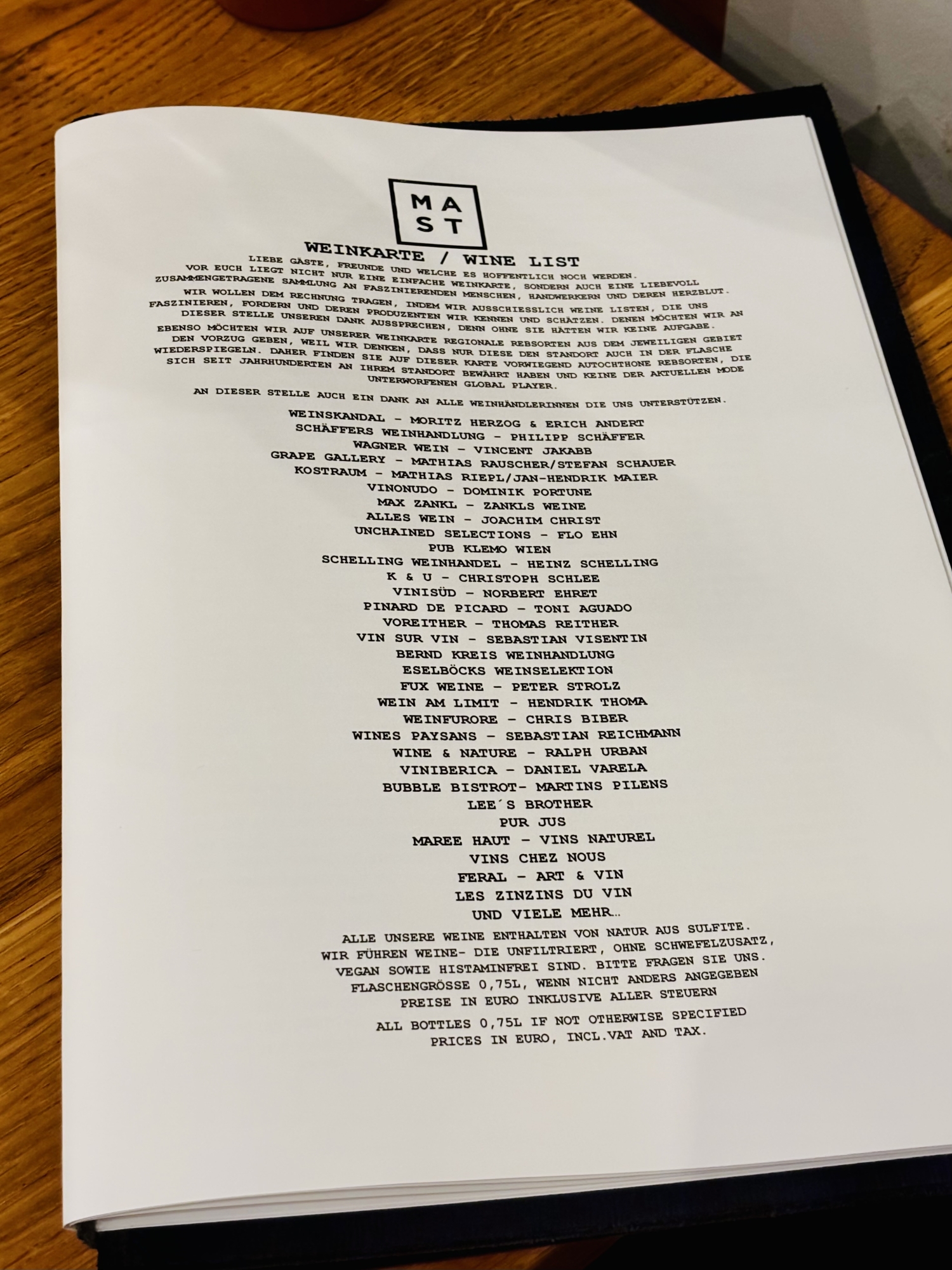 MAST (jedni mówią, że to skrót od Mahlzeit, w wolnym tłumaczeniu: Zjedz dobry posiłek, a drudzy, że od pierwszych liter imion założycieli) to wyróżniona w przewodniku Michelin zieloną gwiazdką i Bib Gourmand restauracja połączona z wyjątkowym w skali Wiednia wine barem. Znajduje się w ładnej kamienicy w Alsergrund, 9 dzielnicy Wiednia.