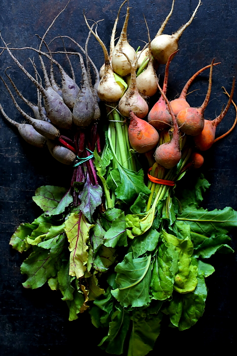 Pod wpływem pary wodnej w pakunkach z folii warzywa szybciej miękną i są niesamowicie delikatne (jak gotowane na parze). Upiekłem je w ten sposób również po to, by sok z czerwonych buraków nie zafarbował pozostałych, jaśniejszych odmian warzyw.