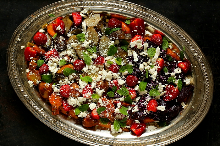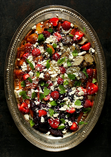Do naturalnie słodkich w smaku buraków i marchewki znakomicie pasują owoce, takie jak na przykład truskawki, maliny, śliwki lub porzeczki, które dodają kwaskowatej nuty. Na tym można byłoby już właściwie poprzestać, ale całość doskonale uzupełnia śnieżnobiała sezonowana ricotta. Równie dobrze sprawdzi się też grecka słonawa feta (ci z Was, którzy mieszkają w Warszawie, mogą zaopatrzyć się w fetę sprowadzaną z Krety – pod Halą Mirowską).