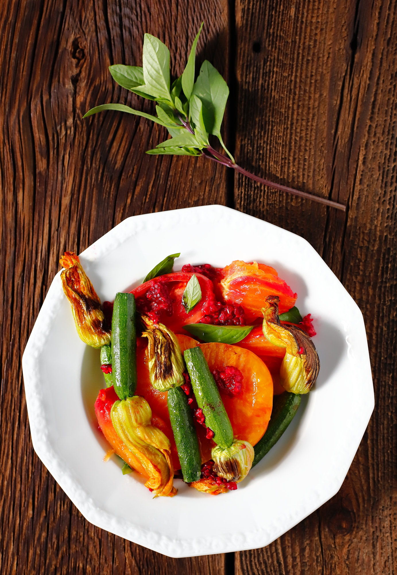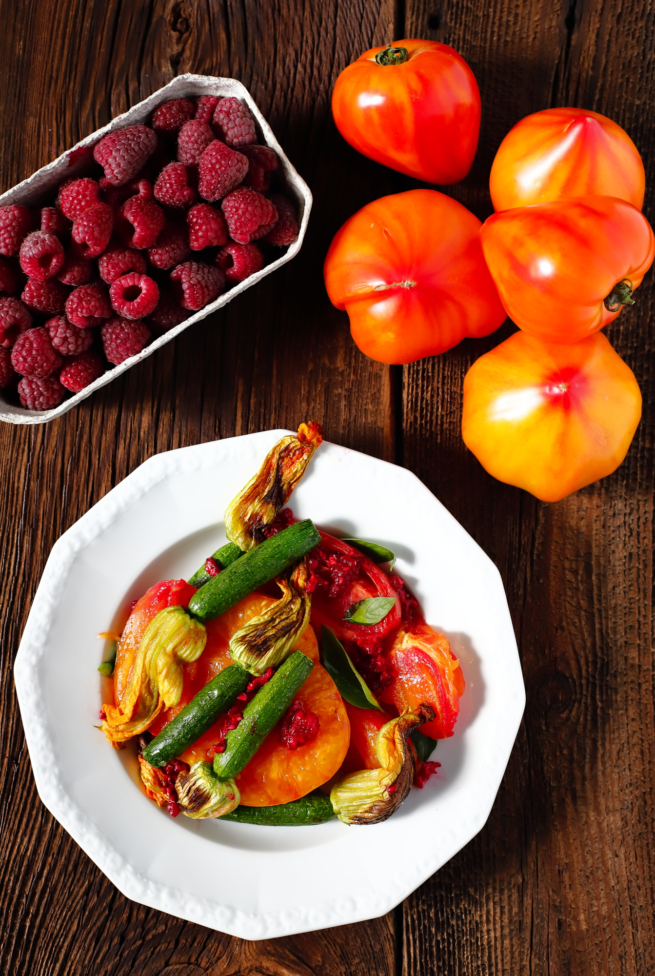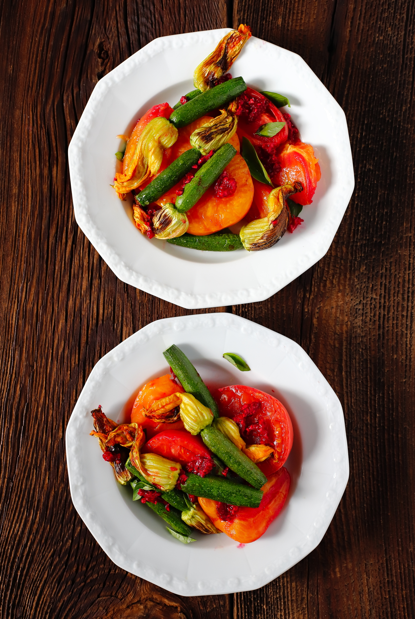 Pieczone pomidory z kwiatami cukinii i malinami – PRZEPIS: