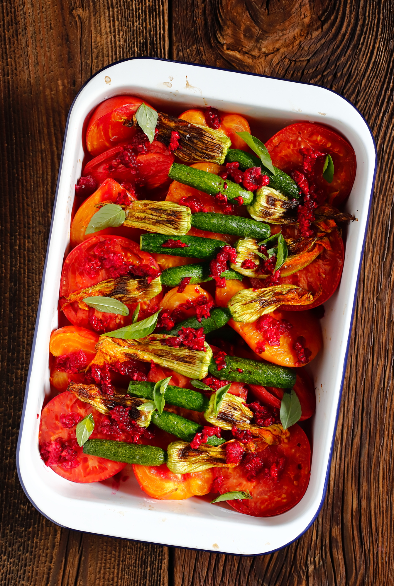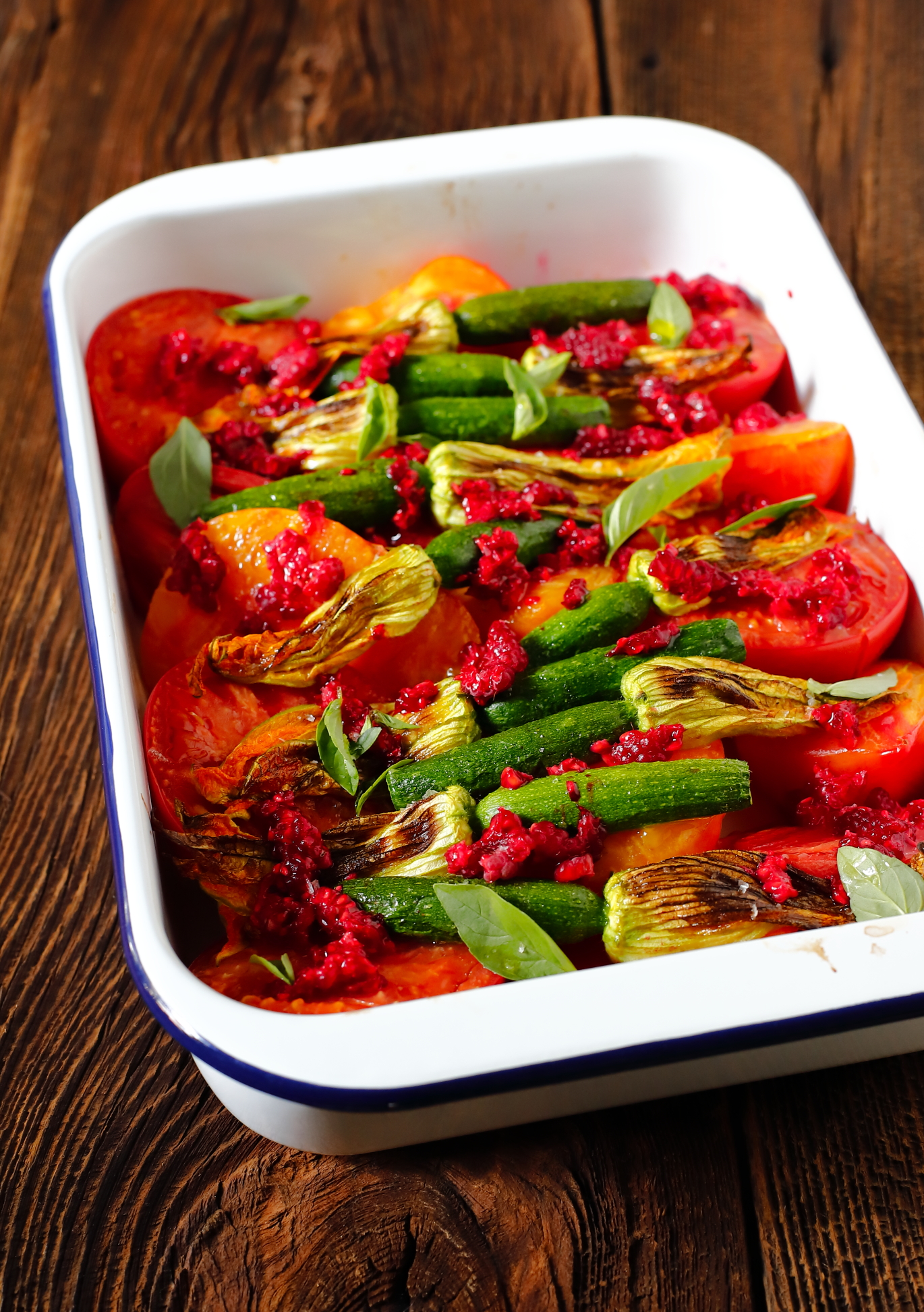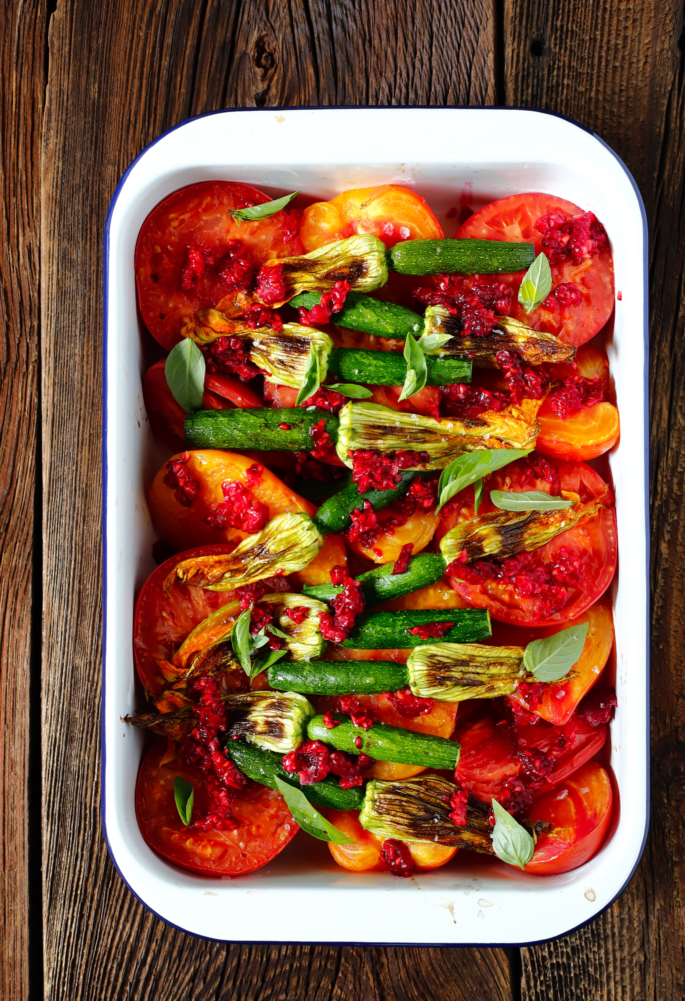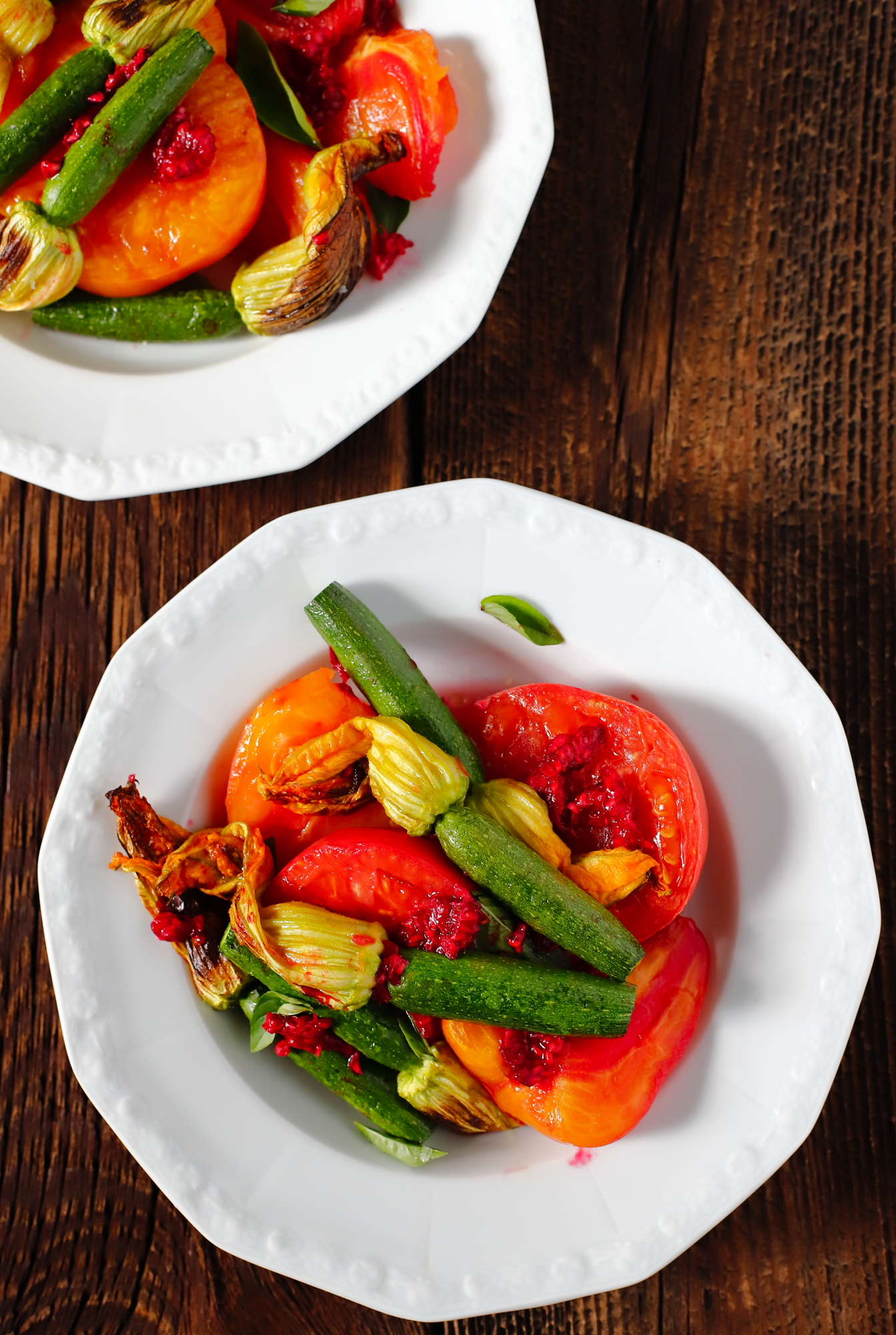 Pieczone pomidory z kwiatami cukinii i malinami – PRZEPIS: