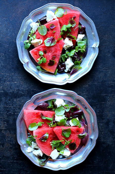 To kolejna nieskomplikowana sezonowa sałatka z ledwie kilku składników, którą przygotujesz w dosłownie 3 minuty. Bazuje na bardzo fajnym kontraście między wyrazistą słodyczą soczystego, dojrzałego w słońcu arbuza oraz równie wyraźnym, słonym smakiem oliwek z dodatkiem łagodnego sera i aromatycznej oliwy. Niczego więcej tu nie potrzeba.