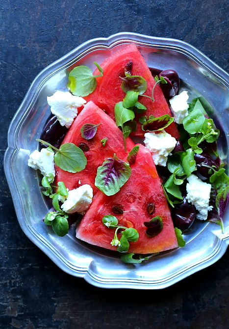 Jak zawsze, najważniejsza jest sezonowość i jakość używanych składników. Arbuzy najsmaczniejsze są teraz – między lipcem a wczesnym wrześniem (przy dobrej słonecznej pogodzie). Później zwykle nie warto zawracać sobie nimi głowy. Twaróg również wybierz najlepszej jakości. Jeżeli nie lubisz koziego lub owczego mleka, użyj sera z krowiego mleka, ale kup go na targu, a nie w supermarkecie. Różnicę zauważysz na 100 procent. I docenisz lepszy wybór :-) Zamiast twarogu możesz dodać również ricottę lub fetę, tak jak w przepisie na sałatkę z arbuza i fety. Polecam też oliwki z pestkami, są zdecydowanie smaczniejsze od drylowanych.