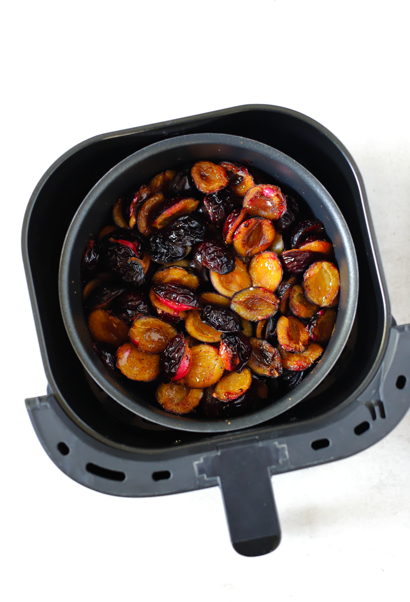 - Śliwki wypestkuj, połówki śliwek wrzuć do naczynia do zapiekania, które mieści się w koszyku airfryera.