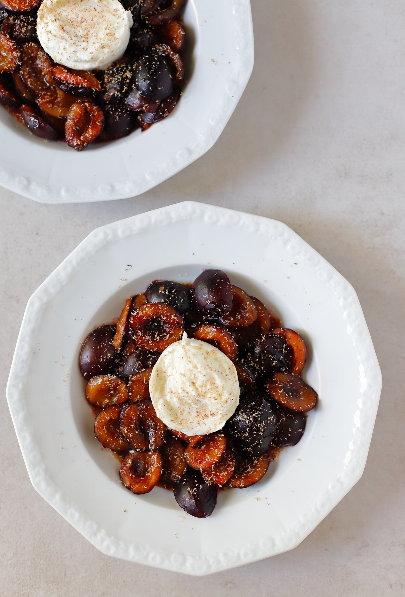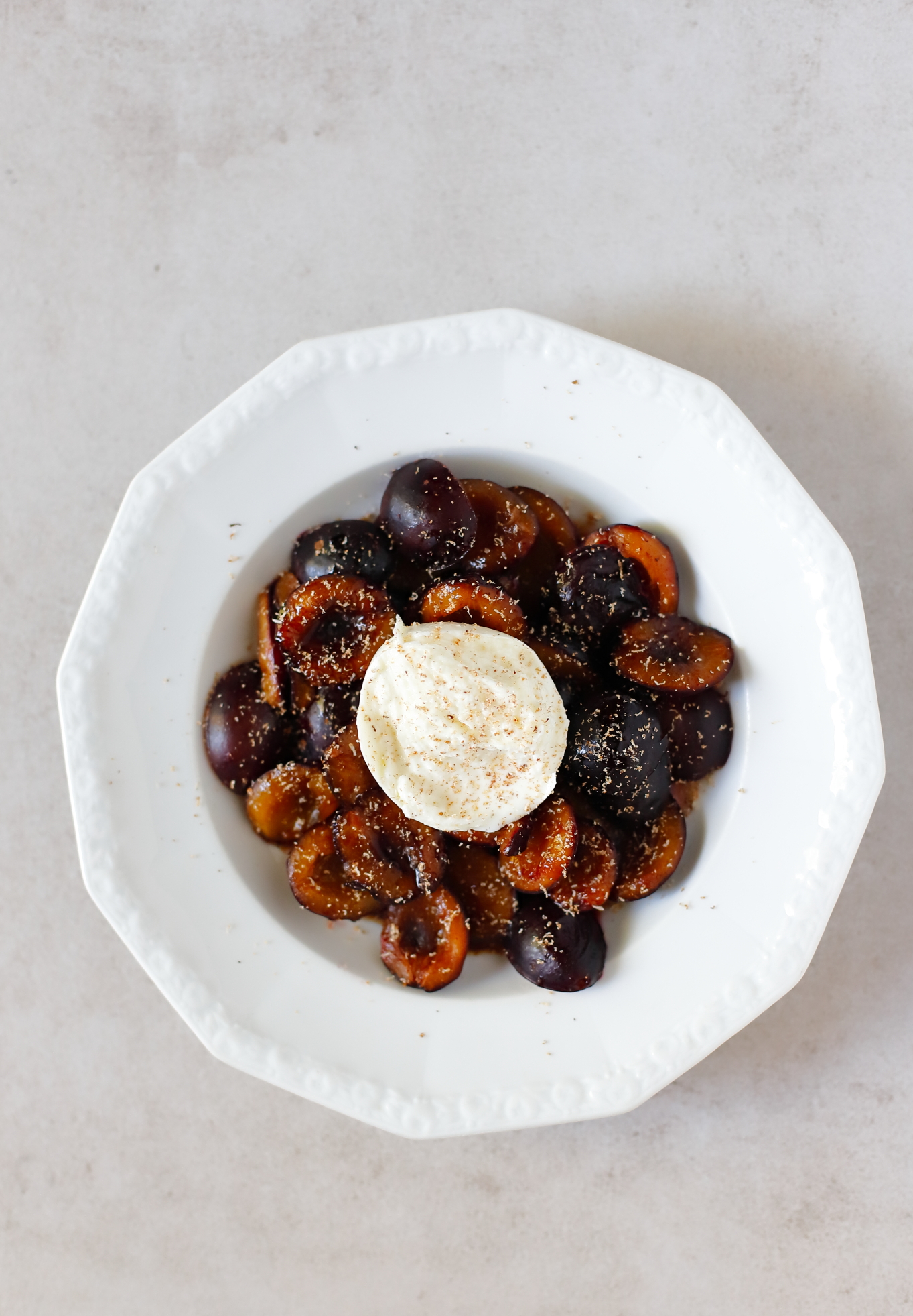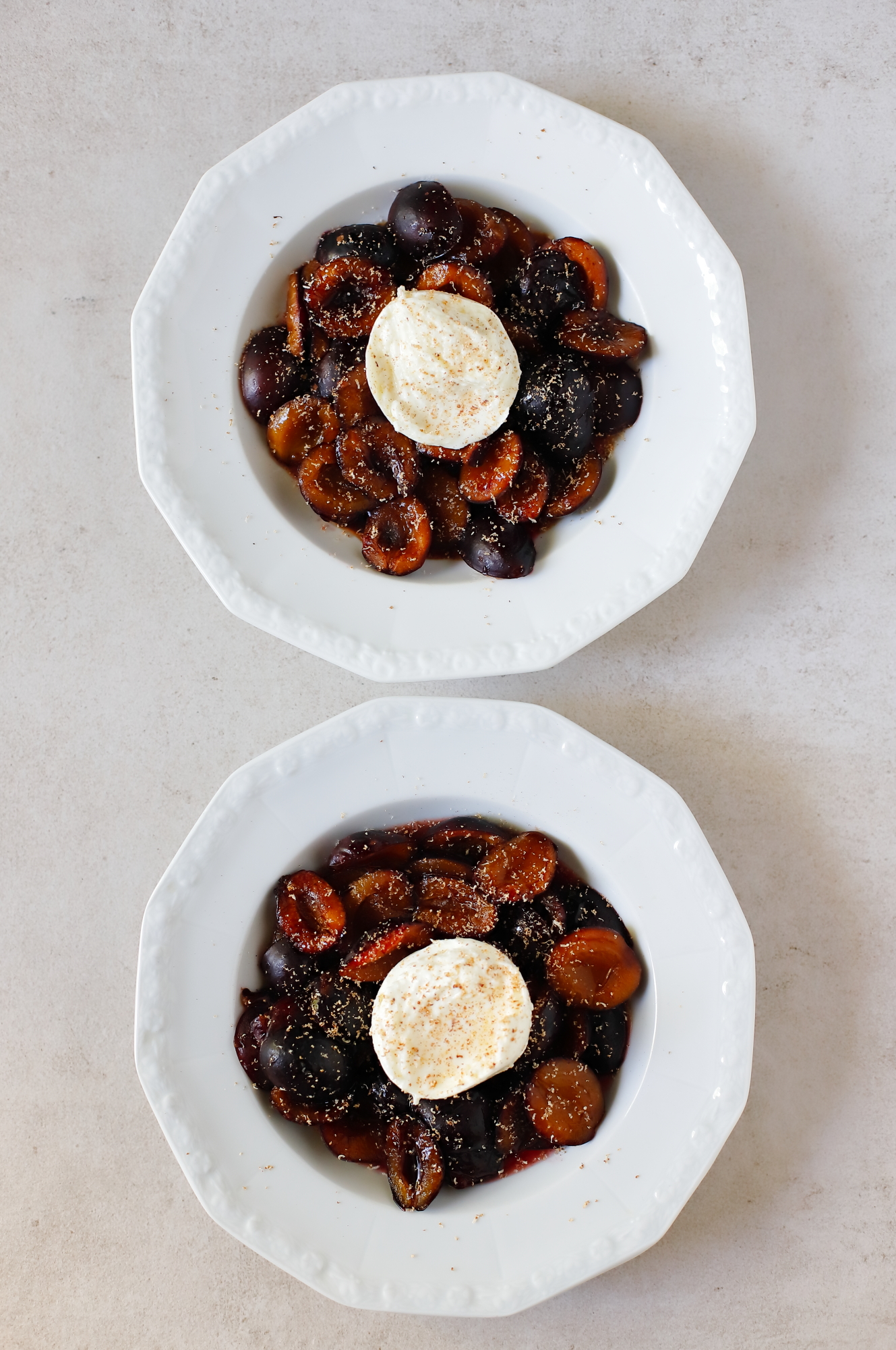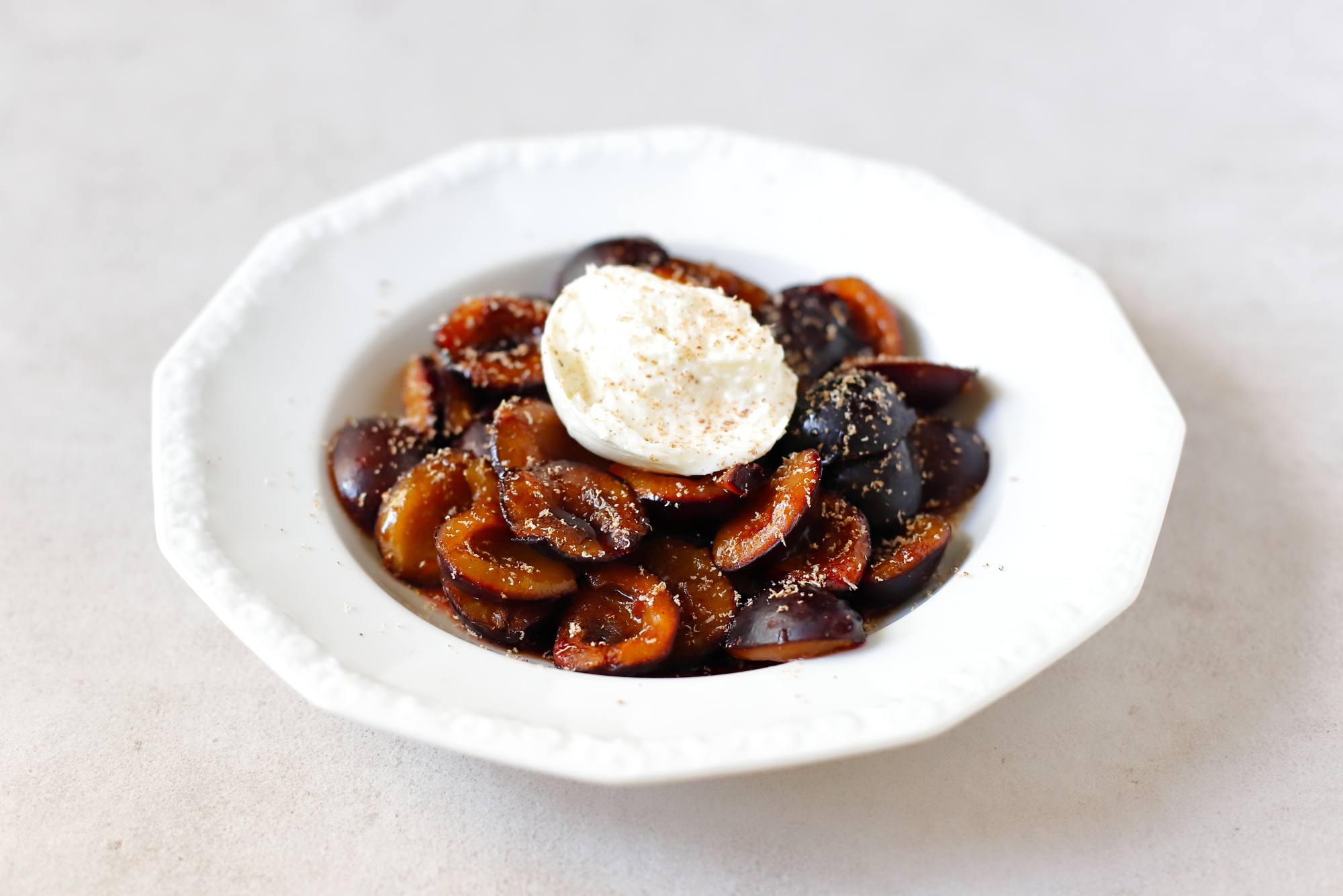 - Upieczone śliwki podziel na porcje, dopraw balsamico i dodaj po połówce mozzarelli (burrata też będzie pasować). Oprósz całość świeżo startą gałką muszkatołową, smacznego!