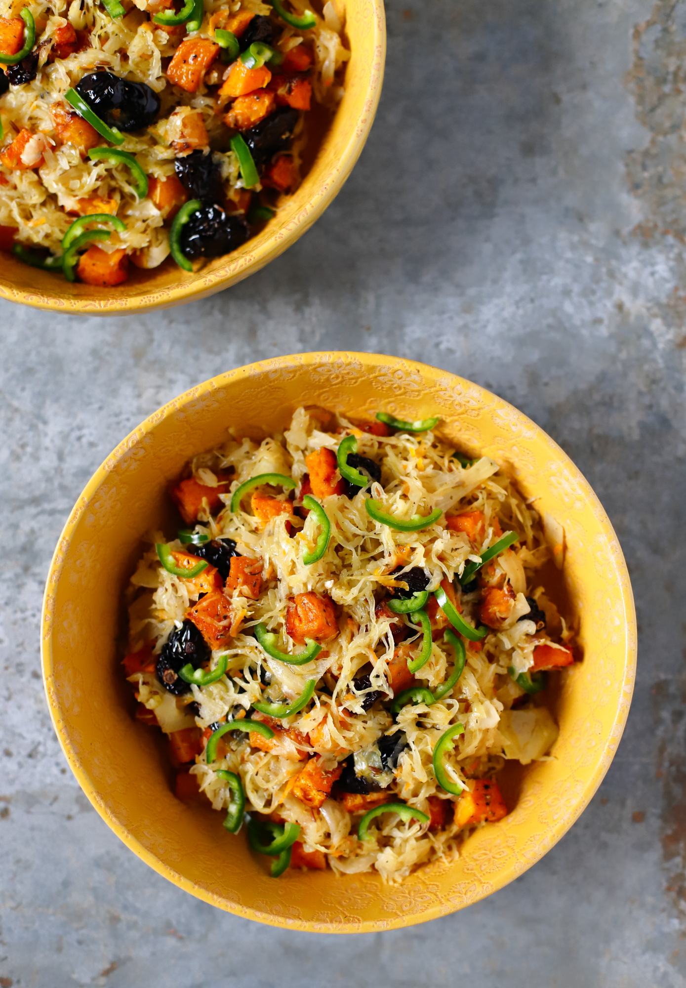 Smażona kiszona kapusta to nasz ulubiony polski zimowy comfort food. Z dynią i śliwkami przyrządziłem ją w minione święta, jako w 100% roślinny zamiennik bigosu.