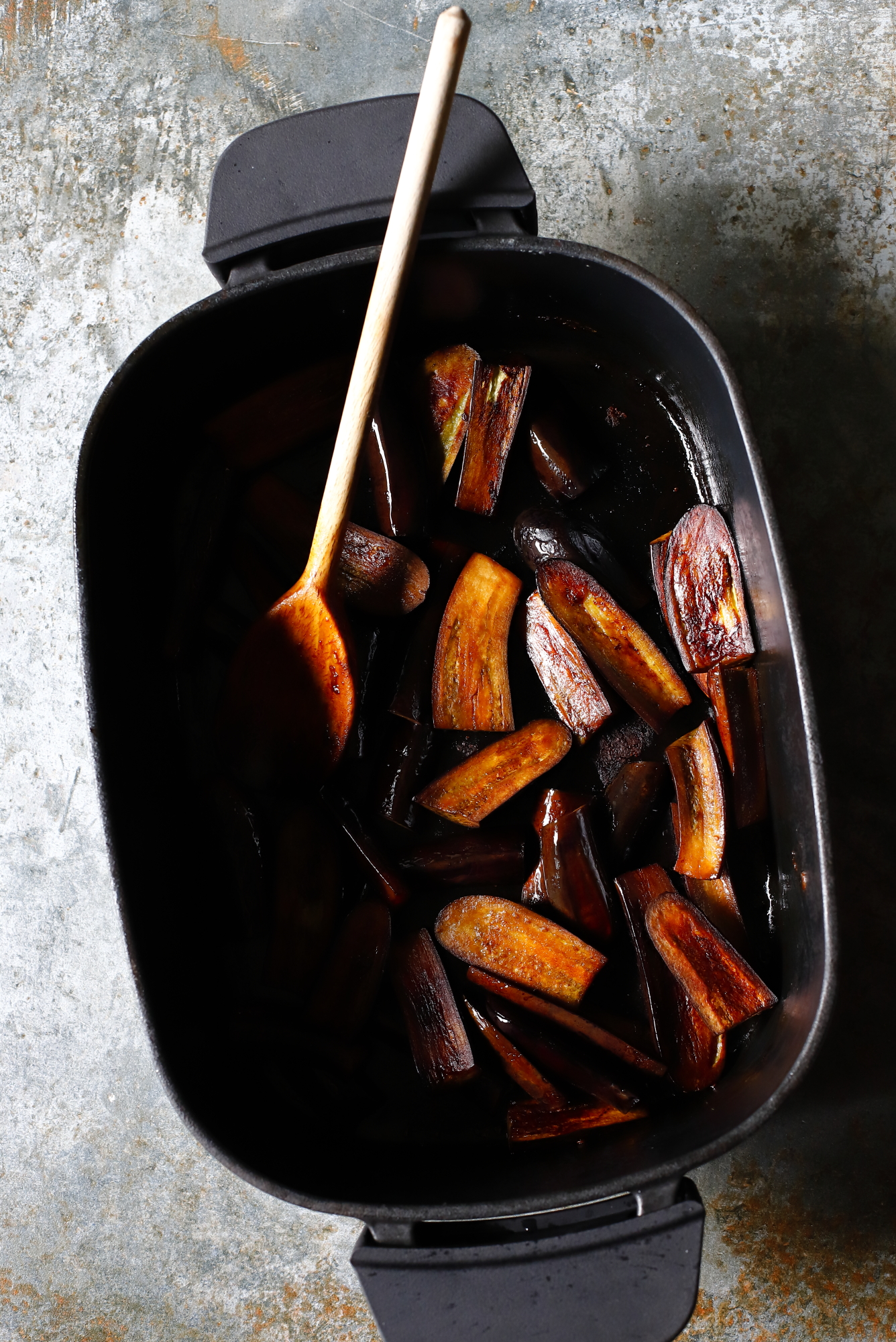 - Wyjmij papryki z garnka, wlej olej i dodaj bakłażany. Ułóż je w pojedynczej warstwie, smaż przez około 8 minut. W trakcie pieczenia przemieszaj raz lub dwa. Ponownie dodaj papryki, wymieszaj i smaż jeszcze 2 minuty.