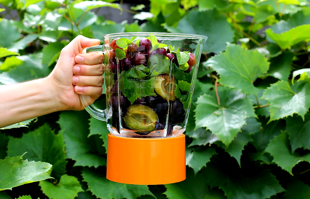 Koktajl śliwkowy z liśćmi winogron.