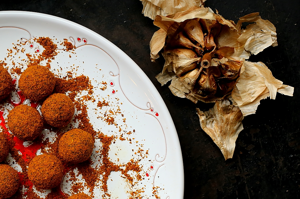 Trufle z czarnym czosnkiem i rokitnikiem.