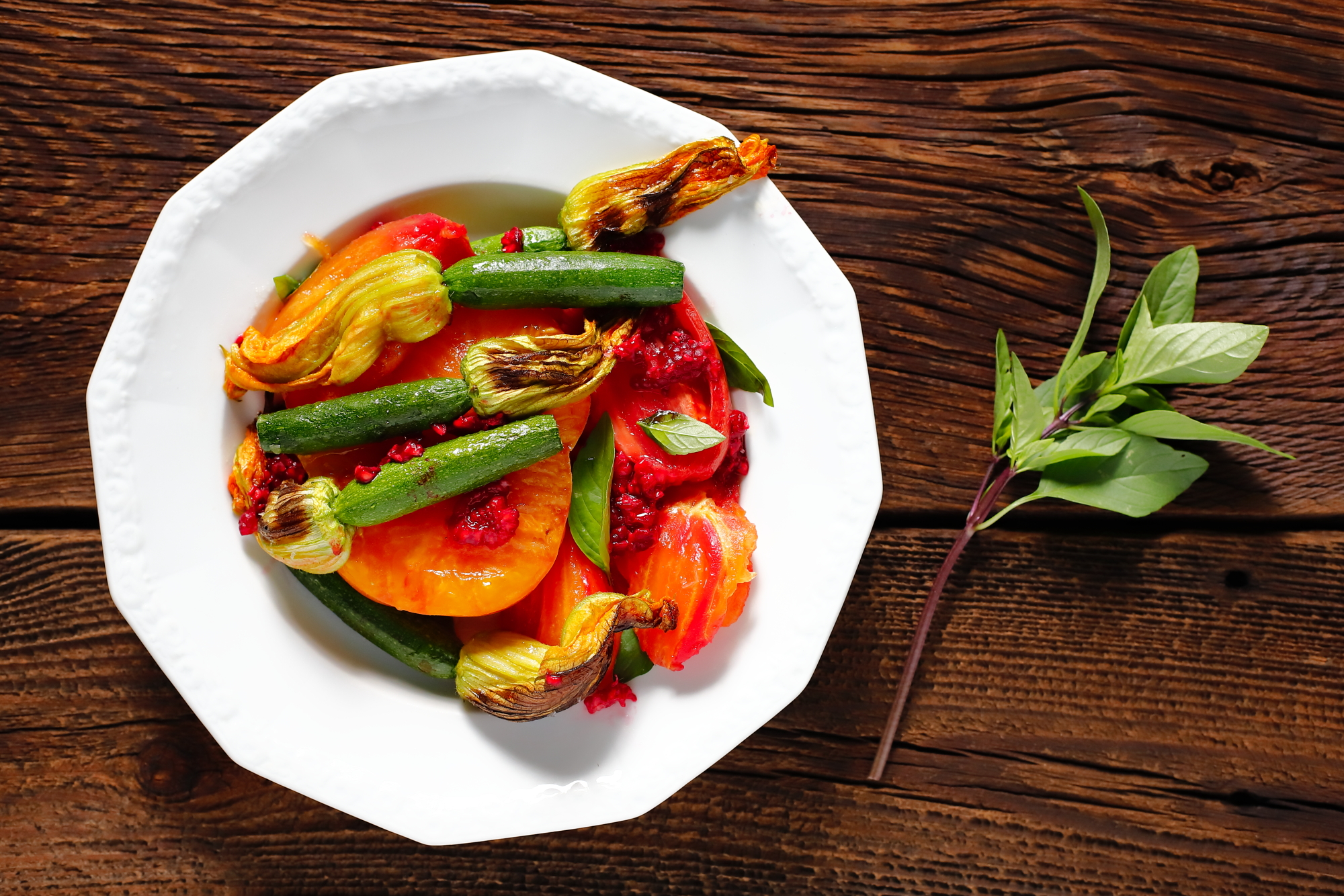 Pieczone pomidory z kwiatami cukinii i malinami.